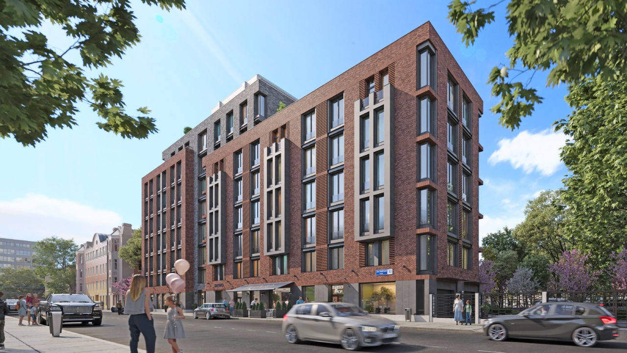 Всего в здании две входные группы, каждая из которых оборудована помещениями консьержа/охранника, помещением уборочного инвентаря и местом временного хранения колясок. Фасады выполнены из кирпича разных расцветок с различными видами кладки (горизонтальная и вертикальная). На главном фасаде, выходящем на Заставскую улицу, выделены два объёма 6 и 7 этажей, выполненных в коричневых оттенках