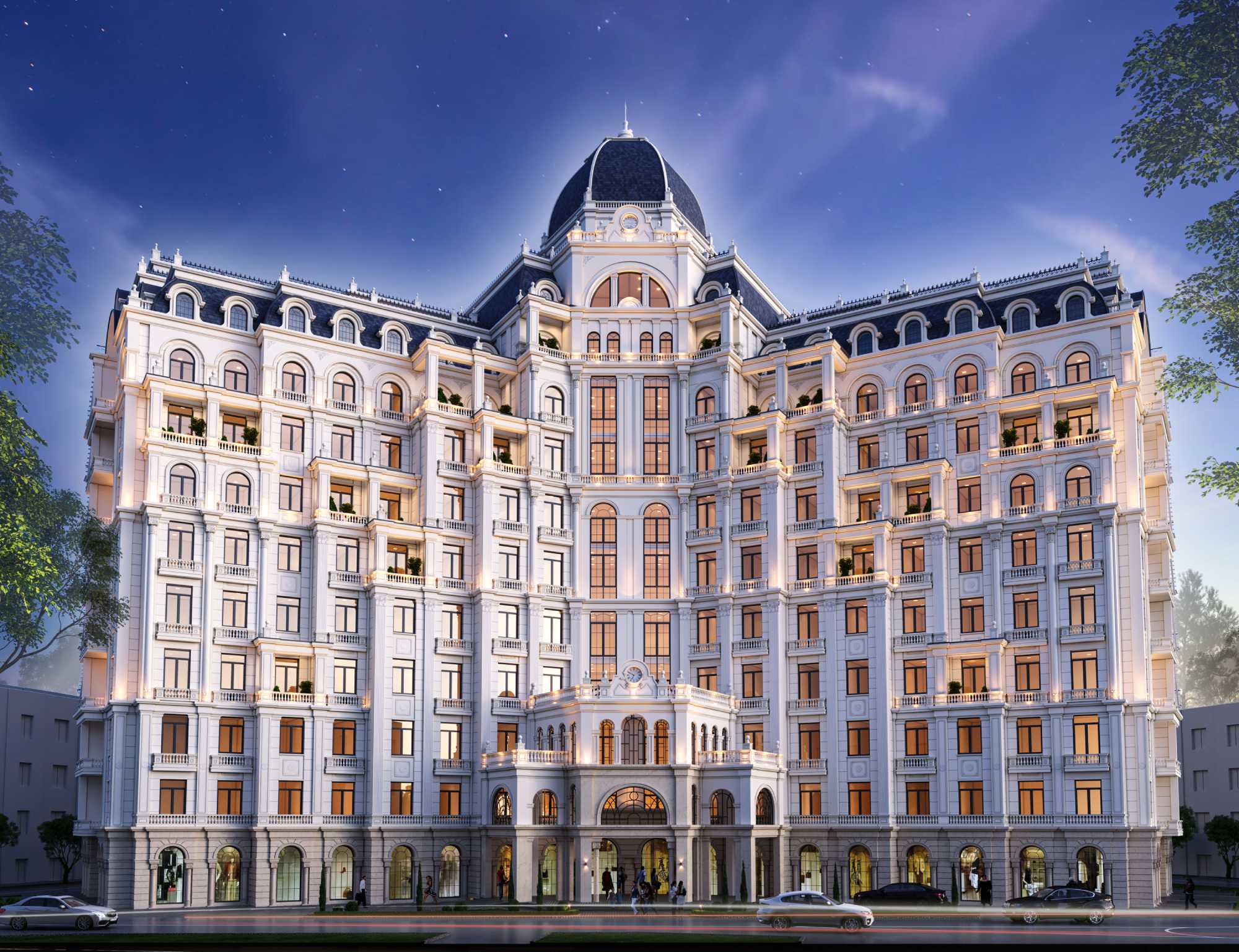 Описание проекта, предоставленное заявителем: Комплекс состоит из 9–10 надземных этажей, включая мансардный. Фасад: Белая и светло-бежевая отделка с акцентами на карнизах, колоннах и декоративных элементах. Подсветка фасада усиливает эффект роскоши в вечернее время.