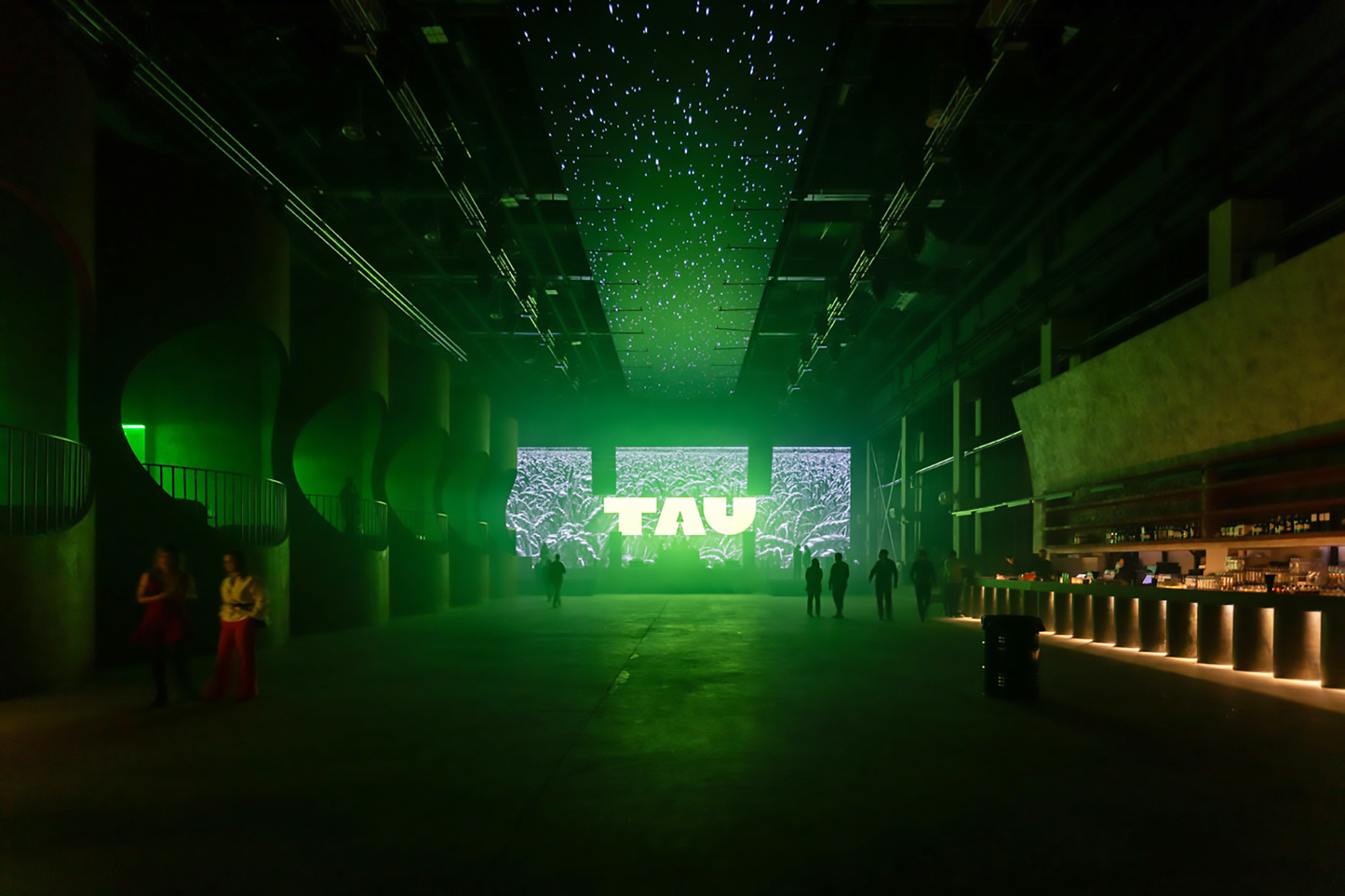 Основной зал TAU, расположенный на территории бывшего завода "Метмаш", представляет собой многофункциональное пространство, разделенное на две зоны. Первая из них посвящена мероприятиям, в ней расположены сцена, танцпол, бары и амфитеатр. Во второй находятся лаунж, чайная, коворкинг, магазин и музейное пространство. А разделяют их объёмы, в которых располагаются помещения для вип-гостей с видом на танцпол и сцену. Визуальная концепция строится на сочетании промышленной архитектуры здания, истории завода "МЕТМАШ" и композиции самого пространства. В основе большинства объектов, наполняющих функциональные зоны, - тема металлических труб, отсылающая к металлургическому прошлому завода. На контрасте с ними используются яркие "кислотные" акценты. В сочетании с бетоном и открытыми инженерными коммуникациями это создает особенную атмосферу, в которую можно погрузиться, находясь в любой точке пространства. Световой дизайн смягчает общую брутальность и техногенность.