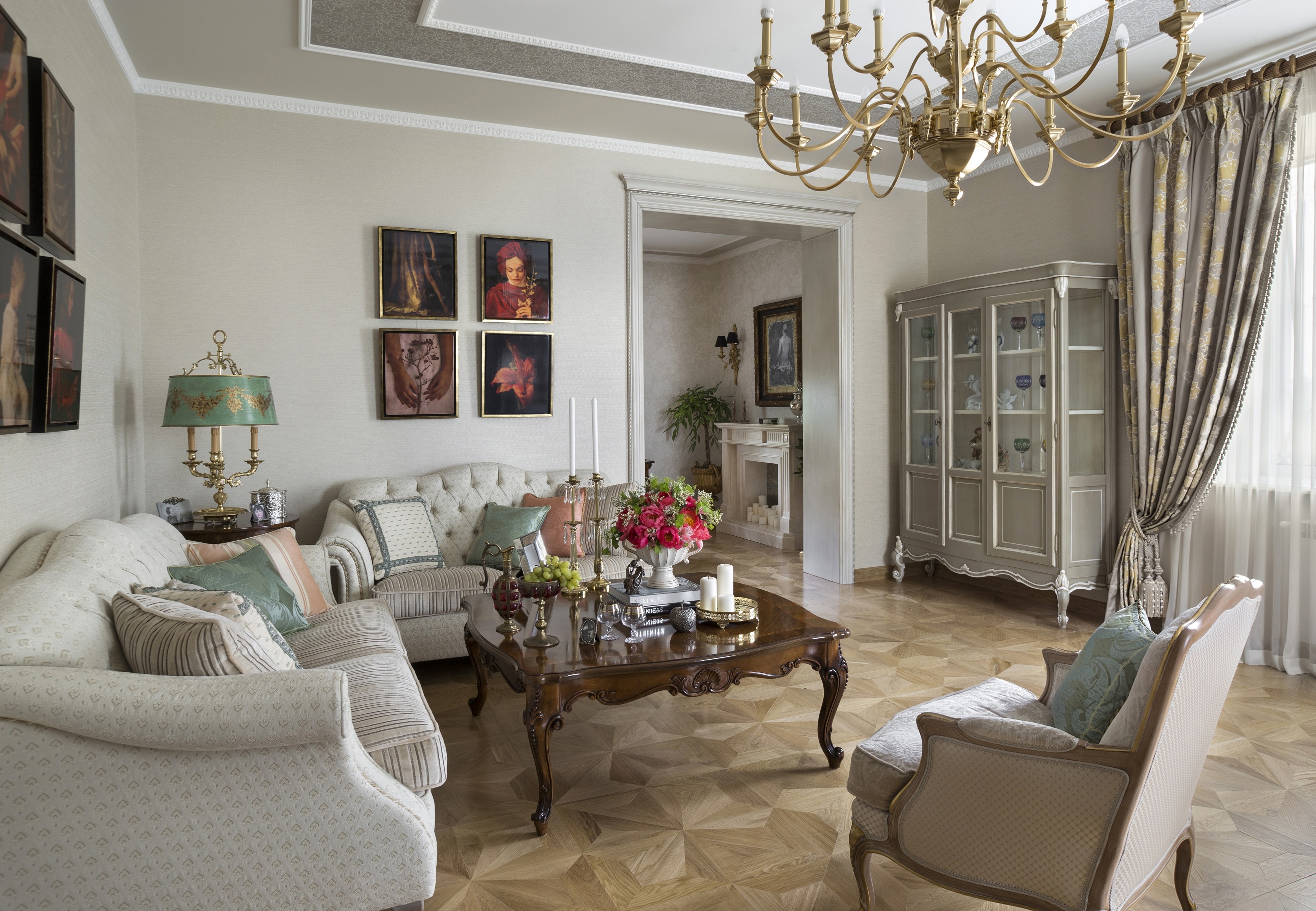 О проекте: Рассказывают авторы проекта: "Несмотря на то, что этот проект задуман и реализован в традиционном классическом стиле, без какого либо вмешательства современности, при его декорировании нам хотелось добавить свежих, неординарные элементы. Мы долго искали и пробовали различные варианты, в какой-то момент мы определили для себя, что нам была нужна «живопись, но не живопись», и это определение привело нас к работам великого фотографа современности Владимира Клавихо-Телепнева. Для гостиной мы выбрали серию работ с прямой печатью на дереве - удивительно ярких и насыщенных цветов, но при этом с магией старинных снимков, а для каминной – потрясающий портрет в технике совмещения фотографии и эгломизе. Эгломизе дает уникальную возможность одновременно смотреть вглубь фотографии и видеть то, что происходит вокруг, - видеть себя, интерьеры, других людей — какую-то отличную от изображенной в кадре жизнь".