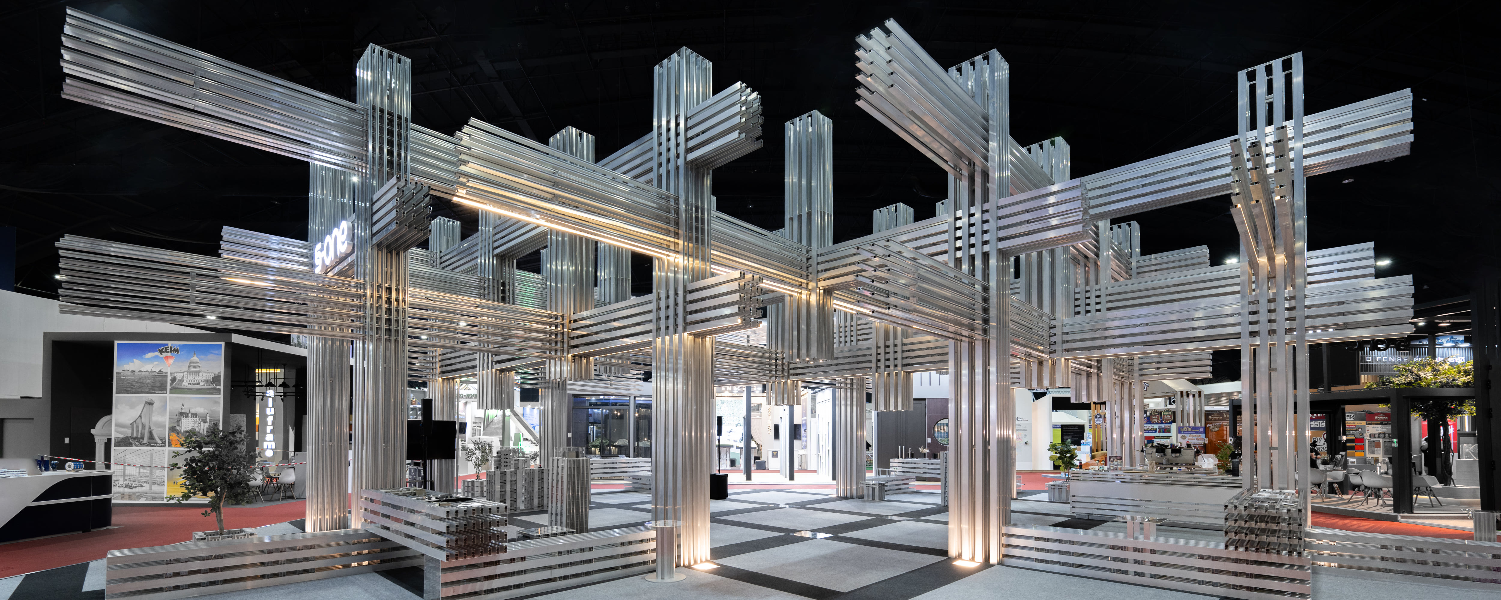 Описание проекта, предоставленное заявителем: Павильон представляет собой временную архитектурную инсталляцию, полностью выполненную из соединённых между собой алюминиевых профилей без использования винтов, сварки или клея. Спроектированная как модульная трёхмерная решётка, конструкция исследует структурный и пространственный потенциал промышленных материалов за счёт точной сборки и повторения элементов. Каждый компонент остался неизменным, что обеспечивает полную разборку и повторное использование конструкции — архитектуру без отходов, легко транспортируемую. Павильон функционирует не только как выставочное пространство, но также включает практические элементы, такие как стойки кафе, скамейки и витрины — всё из той же системы. Рациональная форма, открытая планировка и светящиеся поверхности создают захватывающее пространственное переживание, переосмысливающее алюминий за пределами его привычного применения. Проект предлагает новый подход к устойчивой временной архитектуре — системный, циклический и пространственно выразительный.