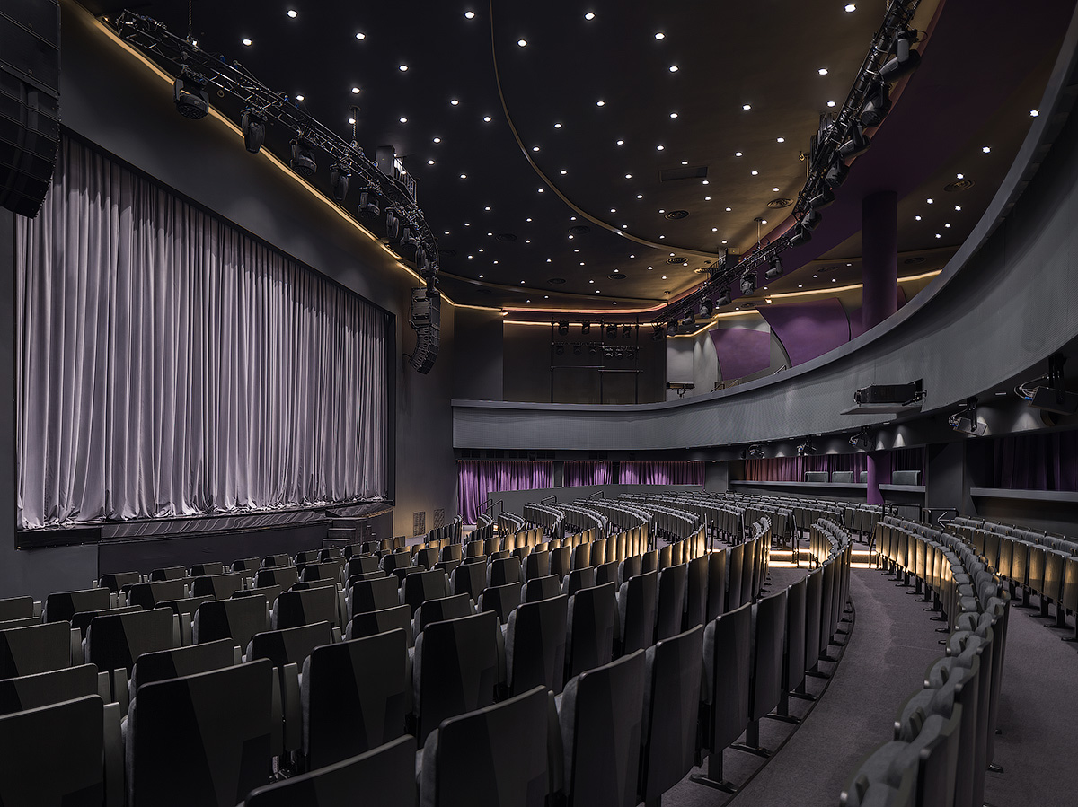 Цветовое решение выдержано в серо-фиолетовых тонах с яркими акцентами, без излишней пестроты. Бархатные фиолетовые портьеры создают театральную атмосферу, а интерьер передает настроение радости и позитива, делая театр центром притяжения современного искусства и развлечений.