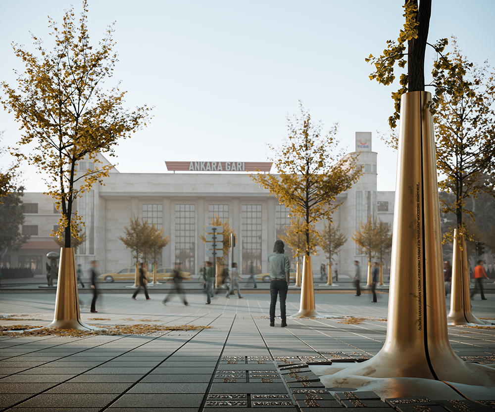 Отталкиваясь от того факта, что человеческое тело является лишь оболочкой для души и разума, авторы проекта предложили увековечить память о погибших, высадив на площади деревья гинкго, защитив их от воздействия среды специально созданными конструкциями. Такие деревья практически нечувствительны к климатическим изменениям и могут служить символом стойкости.