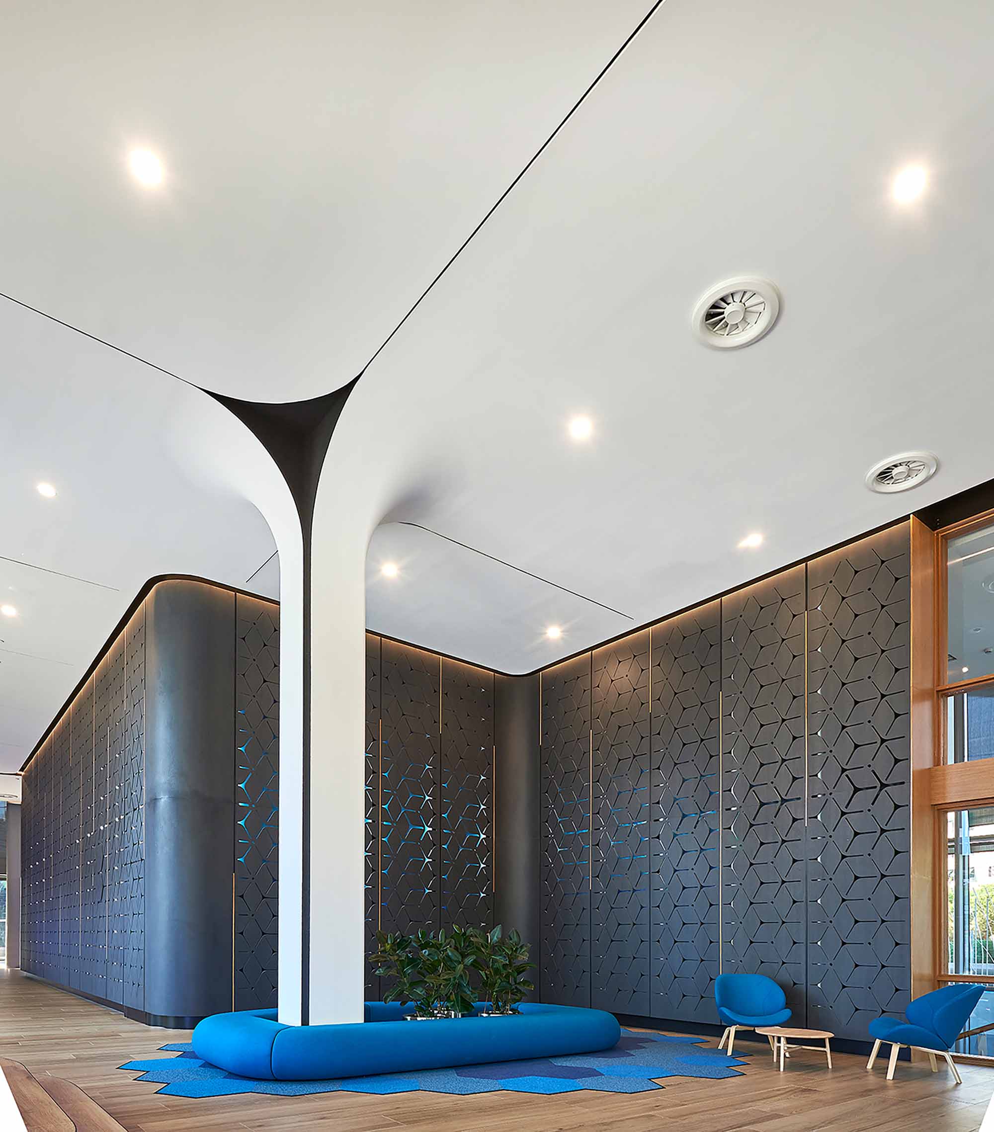 О проекте: Вестибюль небоскреба Marenostrum, название которого можно перевести на русский как «Наше море», оформлен под вдохновением от природы средиземноморского региона. Центральная колонна активно участвует в дизайне интерьера, символизируя дерево с могучей кроной. Темно-серые резные панели на стенах напоминают стаи «морских дьяволов» - самых крупных среди известных скатов. Благодаря мягкой голубой подсветке может показаться, что они движутся.