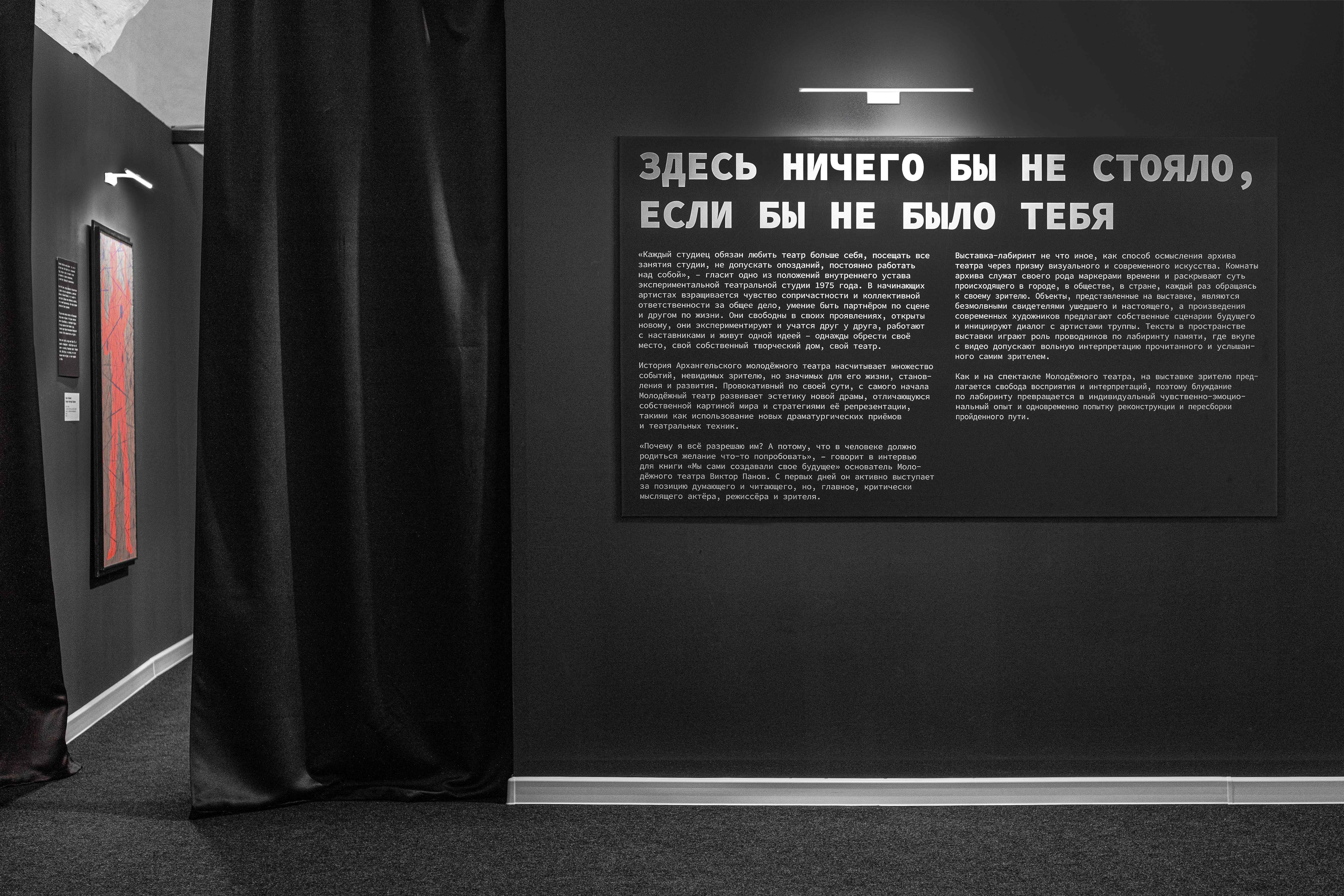 Архангельский Молодежный театр — знаковая для всего города культурная институция, повлиявшая на становление нескольких поколений. Посвященная его 50-летию выставка должна была запомниться зрителям и перенести их за кулисы. Руководство театра пригласило куратора Кристину Дрягину, чтобы продумать наполнение выставки «Здесь ничего бы не стояло, если бы не было тебя», создававшейся вокруг личности руководителя театра. По словам Кристины, «Точка дизайна» разработала 6 новых зон в двух залах историко-архитектурного комплекса «Гостиные дворы». У студии были успешные проекты экспозиционных пространств, поэтому дизайнеры без сомнений взялись за архитектурное оформление придуманной куратором концепции. Екатерине Фёдоровой предстояло полностью проработать интерьер и планировочное решение, чтобы потом перенести его на объект за короткий период. Монтаж конструкций в помещении контролировала Галина Тихонова — вместе с коллегами она часто приезжала в Архангельск, осуществляя авторское сопровождение.