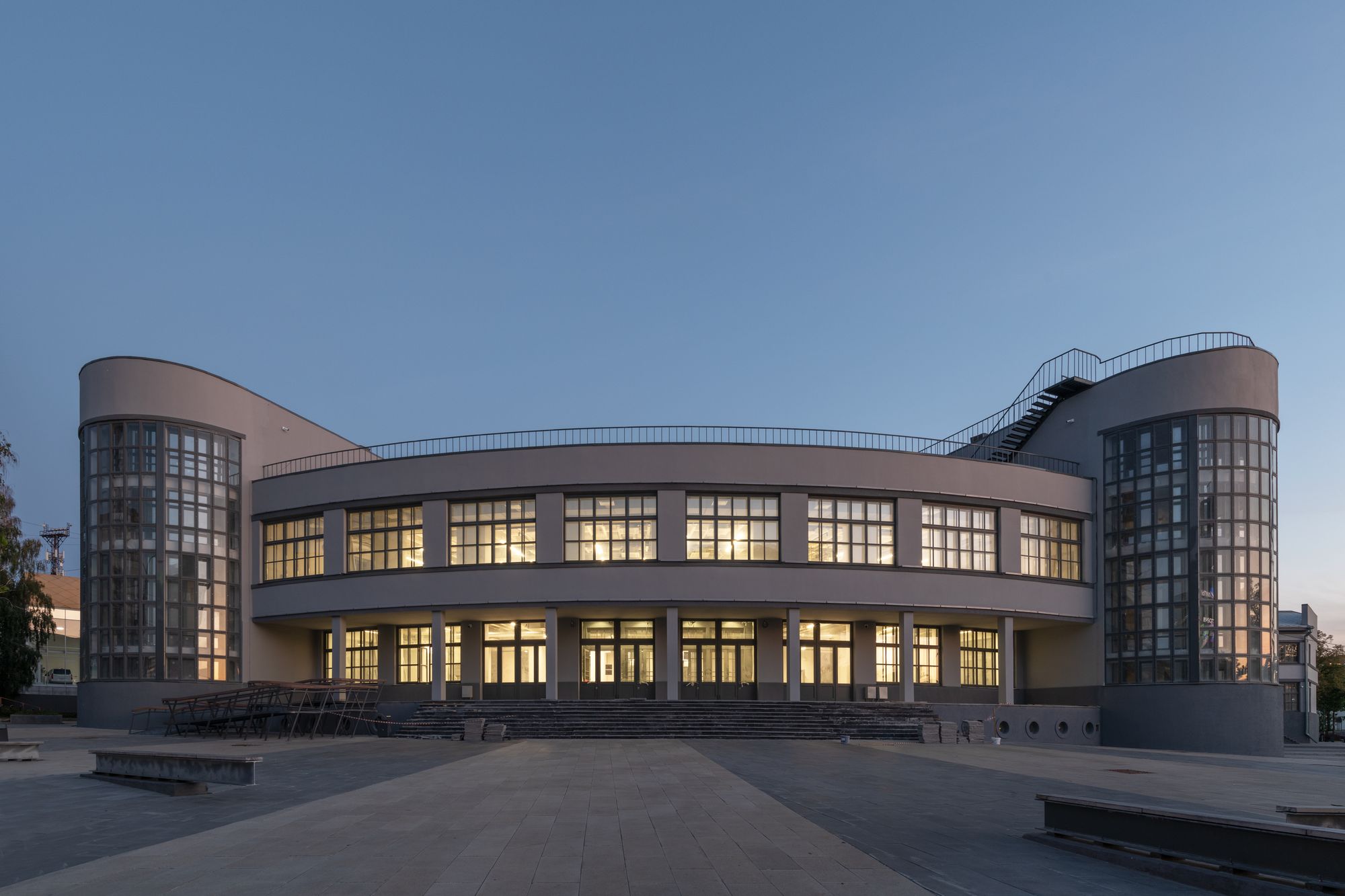 Наиболее выразительными элементами оказались три главные лестницы в виде полукруглых эркеров-стаканов с витражным остеклением. Витражные конструкции не сохранились, их воссоздание выполнялось по историческим фото.