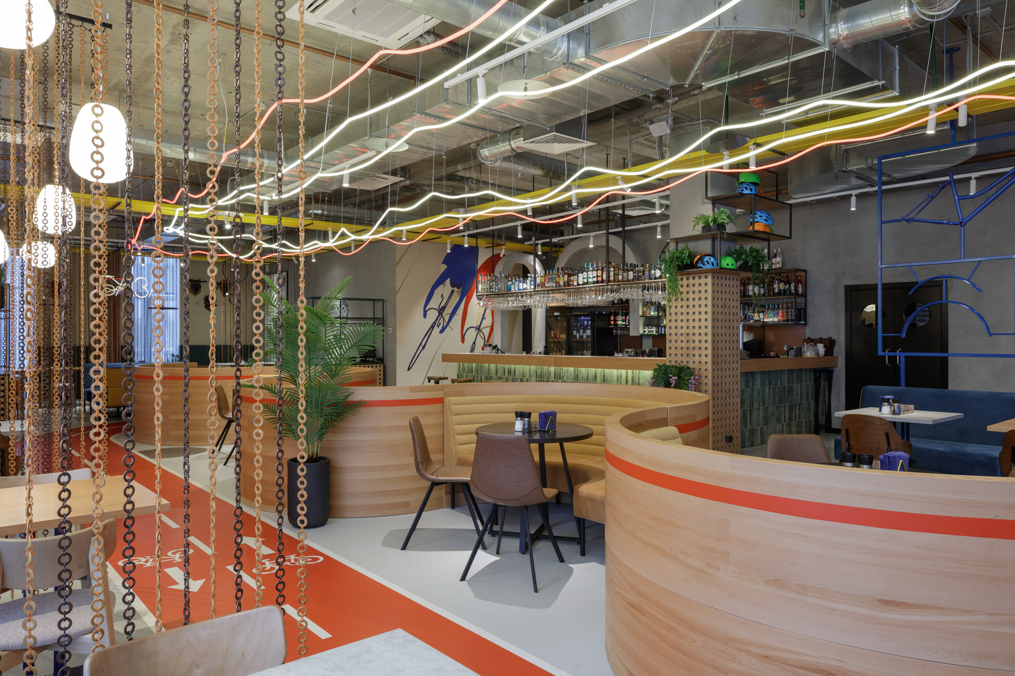 Описание проекта, предоставленное заявителем: Этот ресторан — отличное место для любителей активного отдыха и вкусной еды. Просторный и светлый, вдохновленный концепцией конструктивизма и велоспорта, он отражает дух Крылатского. Мотивы велодорожек здесь передают скорость и энергетику. Интерьер в светлых тонах с минималистичными деталями выглядит стильно и современно. Декоративные элементы погружают в атмосферу велоспорта, делая это пространство идеальным для встречи спорта и гастрономии.