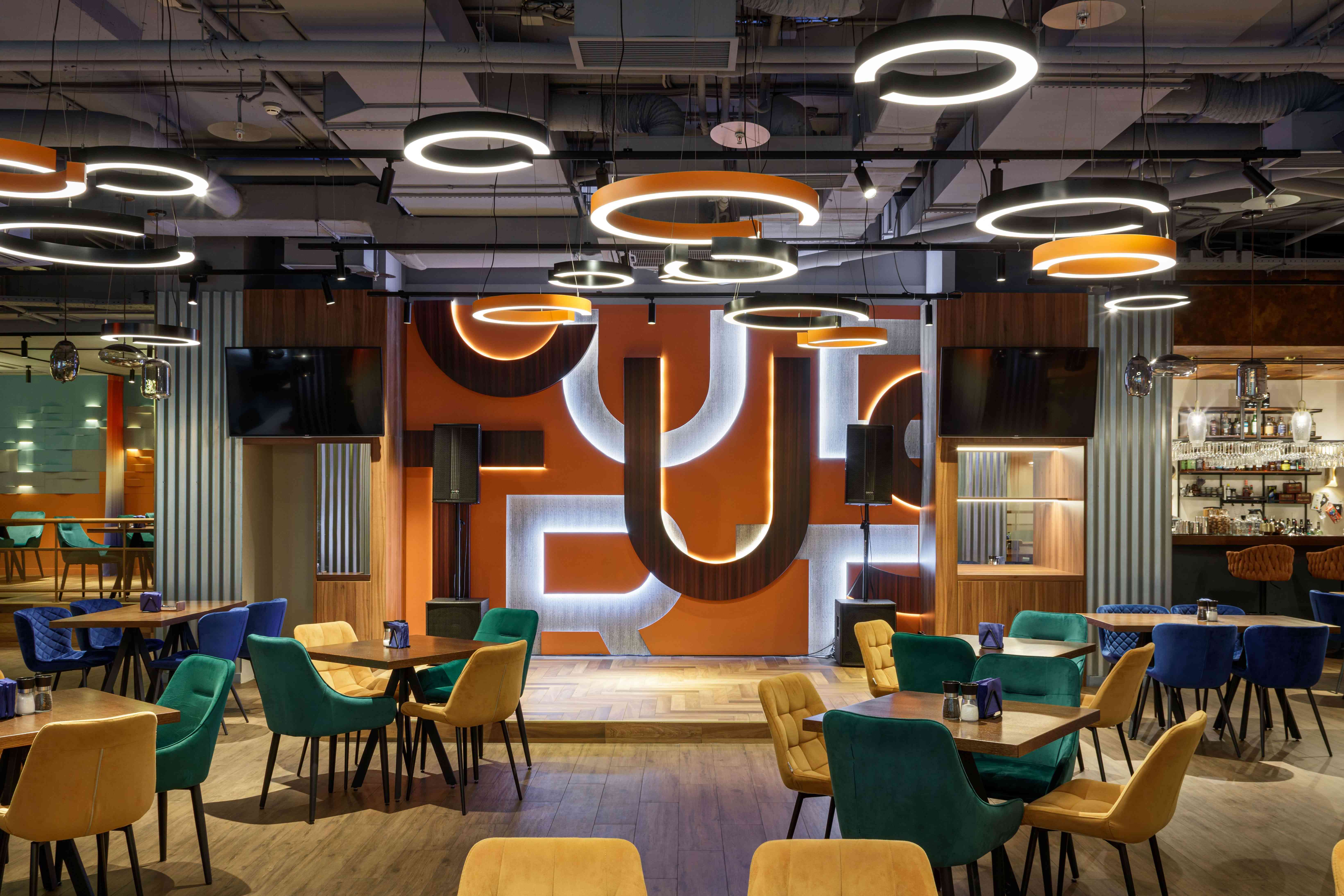 Описание проекта, предоставленное заявителем: Ресторан с просторным и функциональным интерьером сочетает динамичность и уют, используя современные технологии и минимализм. Музыкальная стойка ресепшн, металлическое панно с логотипом и трансформируемые VIP-зоны с подиумами, зонированными шторами и деревянными перегородками, создают уникальную атмосферу. Центр украшает объемная панель с подсветкой, а бар с синими плитками и зеркальными поверхностями добавляет уют. Спокойная цветовая палитра включает оттенки от теплых деревянных до прохладных голубых, открытая кухня позволяет гостям наблюдать процесс приготовления, создают расслабляющую атмосферу, а продуманные зоны обеспечивают комфорт и приватность.