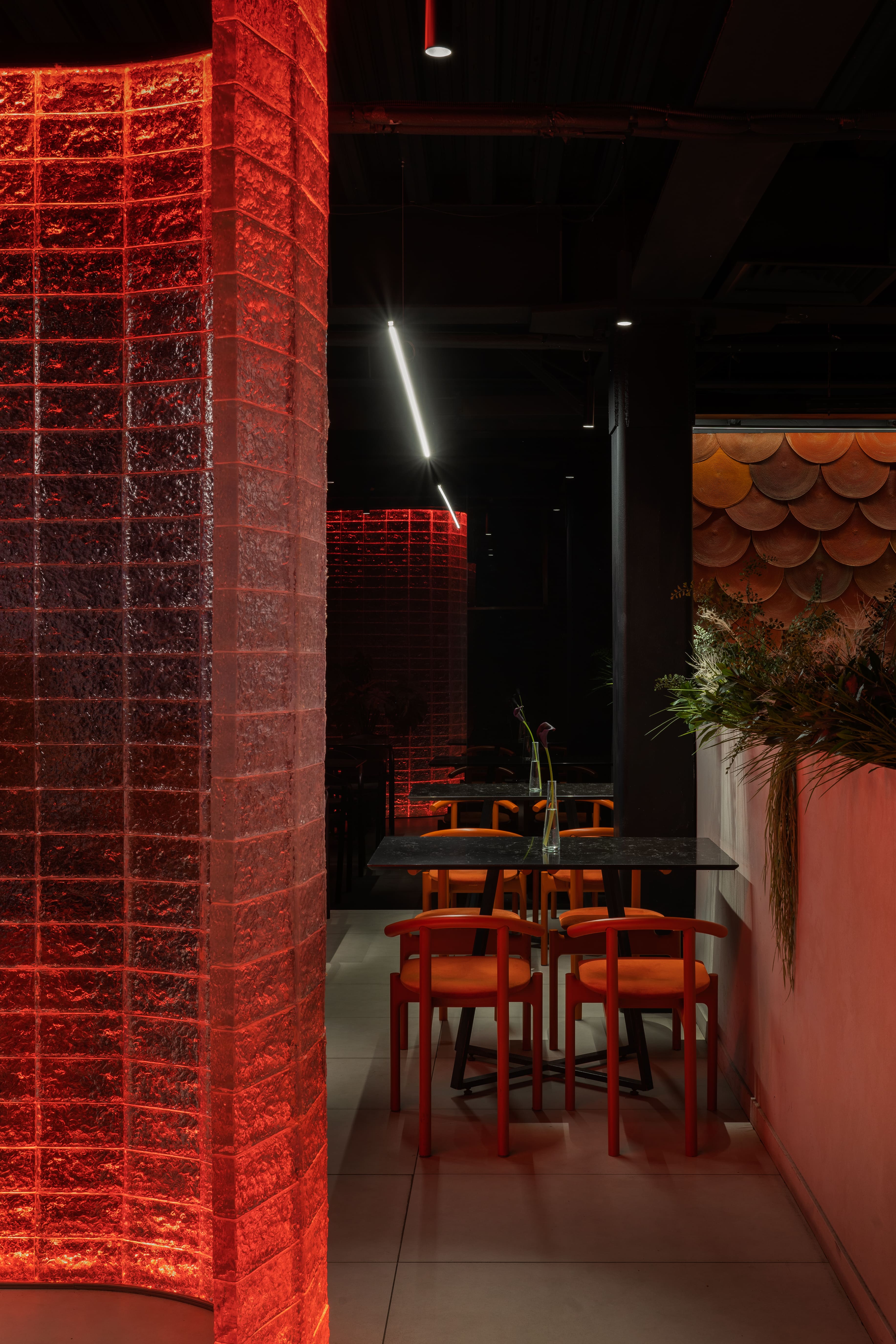 Световые сценарии создают контраст дня и ночи: мягкое освещение сменяется красной подсветкой стеклоблоков, напоминающей ночной Токио. Лаконичные формы и натуральные материалы сочетаются с деталями: перегородками «сэдзи», мотивами «кипу», ротанговыми панно ручной работы.