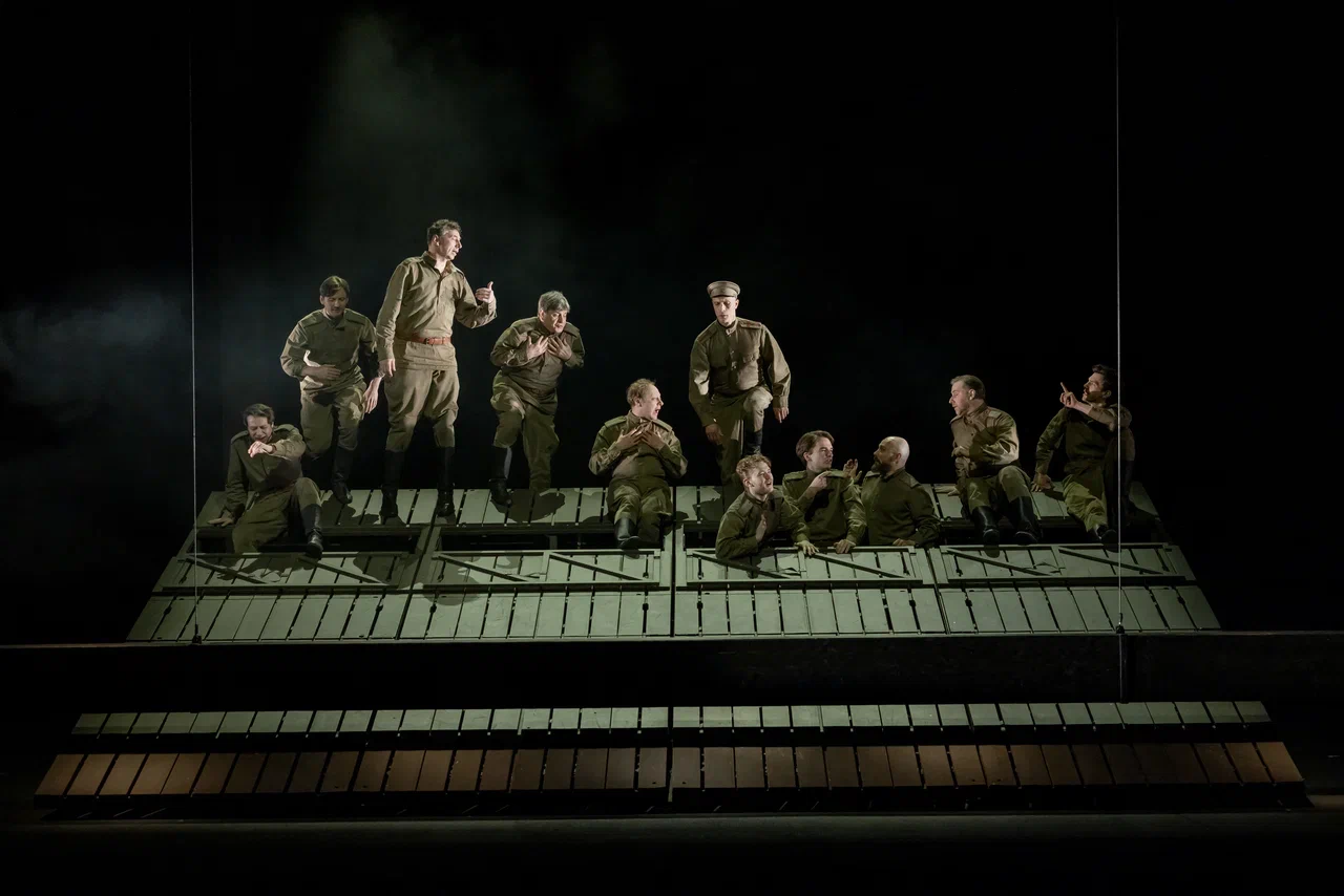 Декорация представляет собой помост-станок из 4 частей, где каждая часть может передвигаться по сцене независимо от других. Этот помост — понтоны на переправе, он же и траншеи, он же, за счет открывающихся в нем люков, кузов машины и подпол в избе. Игровое пространство делится на участки на помосте, под помостом и в промежутках на планшете сцены. Деревянный настил из досок окрашен в защитный цвет хаки. Под станками встроен свет, позволяющий в сцене борьбы солдата со смертью показать оба мира, мир живых и мир умерших. Все пространство решено единой установкой, которая в зависимости от сцены становится то понтонами, то убежищем, а то и братской могилой.