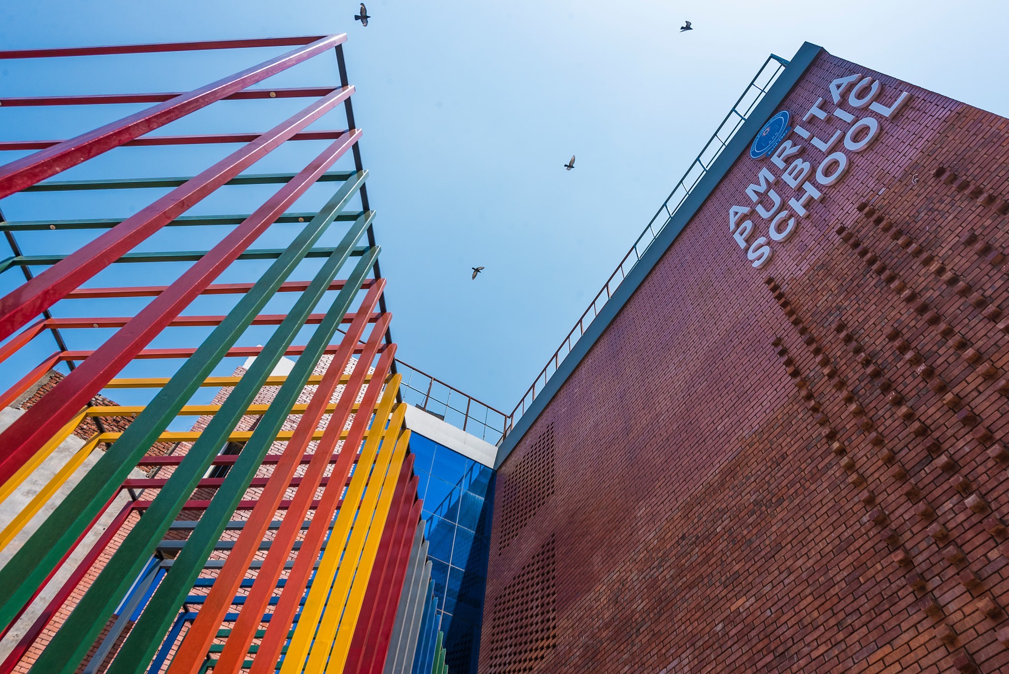 О проекте: Ученики проводят в школе большую часть жизни. В этот период стремительного развития и освоения новых знаний школа должна стать для них источником вдохновения и местом для творчества. Именно здесь они должны учиться осознанности и ответственности. Угловой вход в школу с северо-западной стороны обозначен яркими декоративными рейками и имеет естественное освещение и вентиляцию. Передний фасад облицован неокрашенным кирпичом, благодаря чему здание гармонично сочетается с зеленью вокруг. Текстурная цементная отделка некоторых поверхностей дарит ощущение тепла и аутентичности. Треугольники ярких цветов на окнах – своего рода вымпелы, задающие радостный настрой.