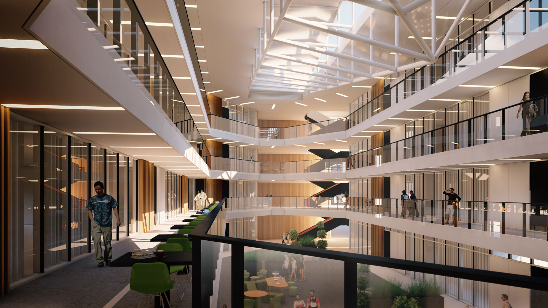 По периметру каждой ячейки расположены учебные помещения, в центре — пространство атриума с антресольными этажами. Система переходов и коридоров позволит проходить все три корпуса по тёплому контуру. Проходы обеспечены в функциональных помещениях, через корпуса-ячейки, здания библиотеки, столовой и залов.