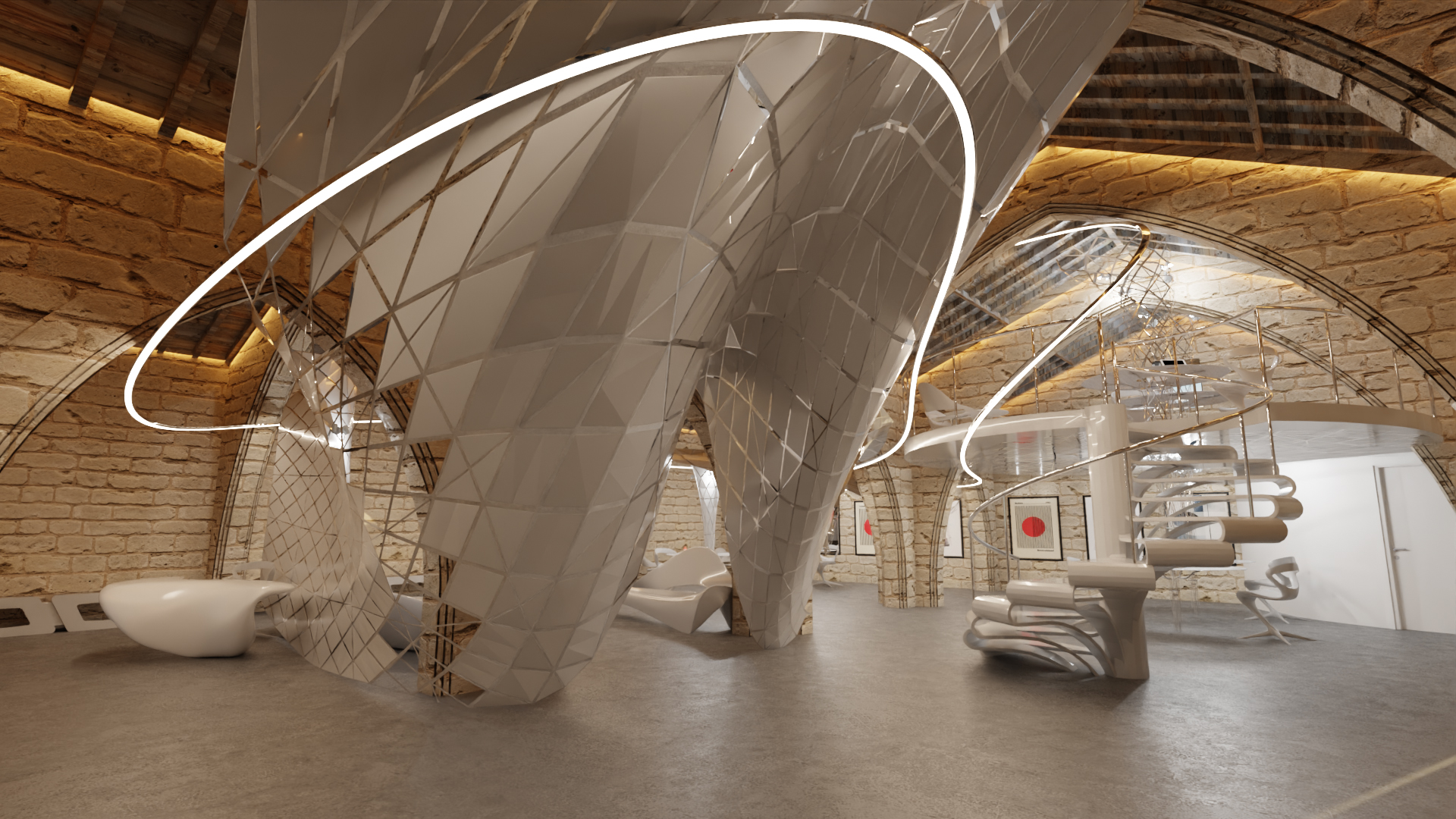 В этом проекте пространство формируется из трёхмерных векторов — нематериальных сил, таких как растяжение, сжатие, кручение, сдвиг и изгиб, которые формируют как структуру, так и опыт пребывания. Параметрическая сетка динамически реагирует на эти силы, развиваясь в органическую форму, которая определяет внутреннее пространство. Современное вмешательство контрастирует с исторической кладкой здания, при этом оба элемента сосуществуют в аккуратном балансе. Структурная логика новых элементов дополняет устойчивые текстуры прошлого, создавая симбиоз, где движение и давление порождают как плавность, так и функциональность.