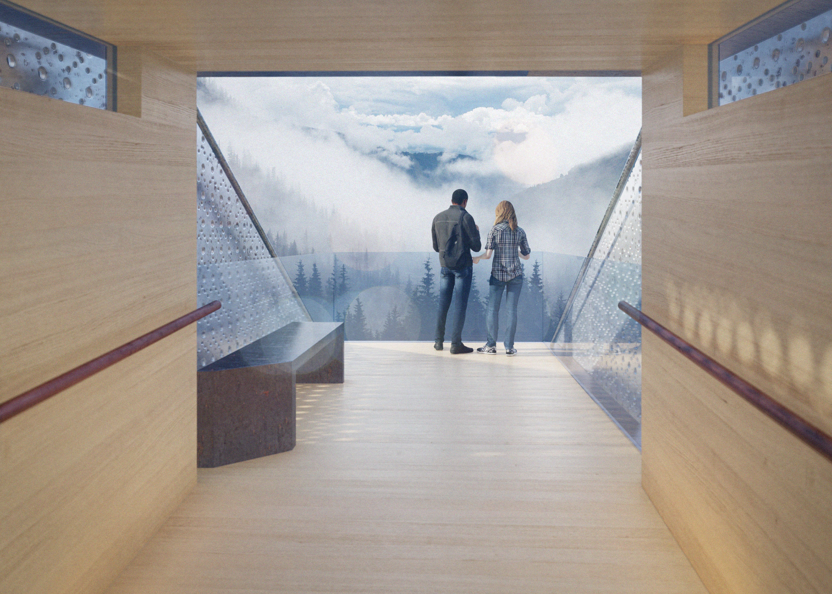 О проекте: Три платформы с помощью консолей предлагается закрепить на скале и использовать в качестве обзорных площадок, с которых открываются виды вверх, вниз и на уровень горизонта. Центральная платформа – самая закрытая – фокусирует внимание посетителей на линии горизонта. Боковые платформы, соответственно, открывают обзор вниз, на скалы, и вверх, на небо. Вход на все платформы осуществляется из общего вестибюля, при этом посетители могут выбрать, какой вариант для них комфортнее и привлекательнее. Обзорные платформы на г. Веттер – это общественное пространство, способное пробудить в каждом вдохновение.