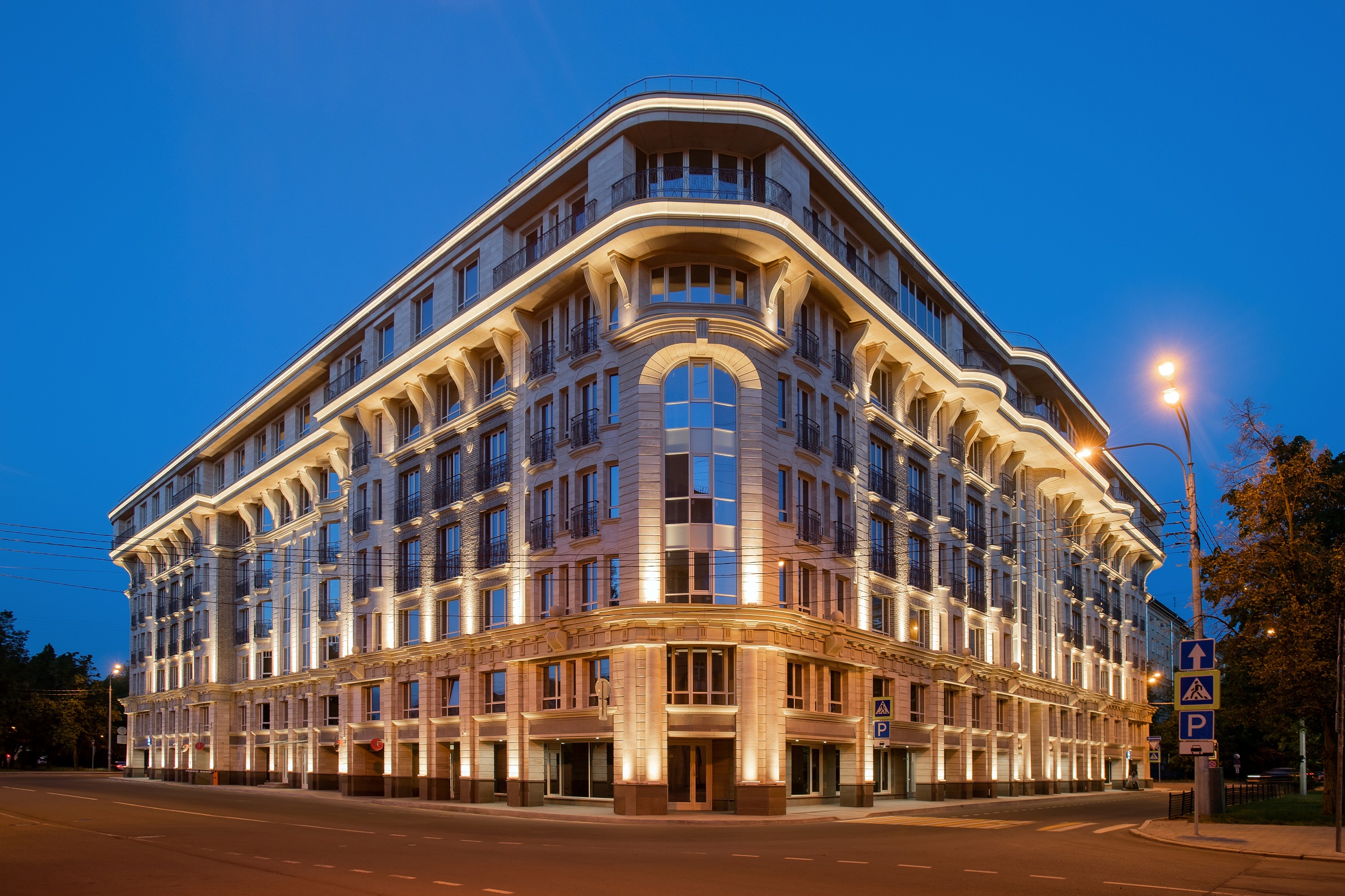 Выразительный экстерьер здания в бело-золотой гамме подчеркивает мягкая желто-оранжевая подсветка, органично вписывающая строение в окружающее пространство и ландшафт. В проекте используется оптика небольшого диапазона свечения: свет не попадает в окна и визуально комфортен для прохожих, а само здание выглядит легким и воздушным. В здании угадываются элементы ар-деко: для аккуратных форм применен контурный эффект с помощью светильников LINE. Консоли, поддерживающие карнизы, освещают маломощные прожекторы KUB с овальной оптикой, создавая баланс света и тени. В рустах оконных проемов, на угловых ризалитах
