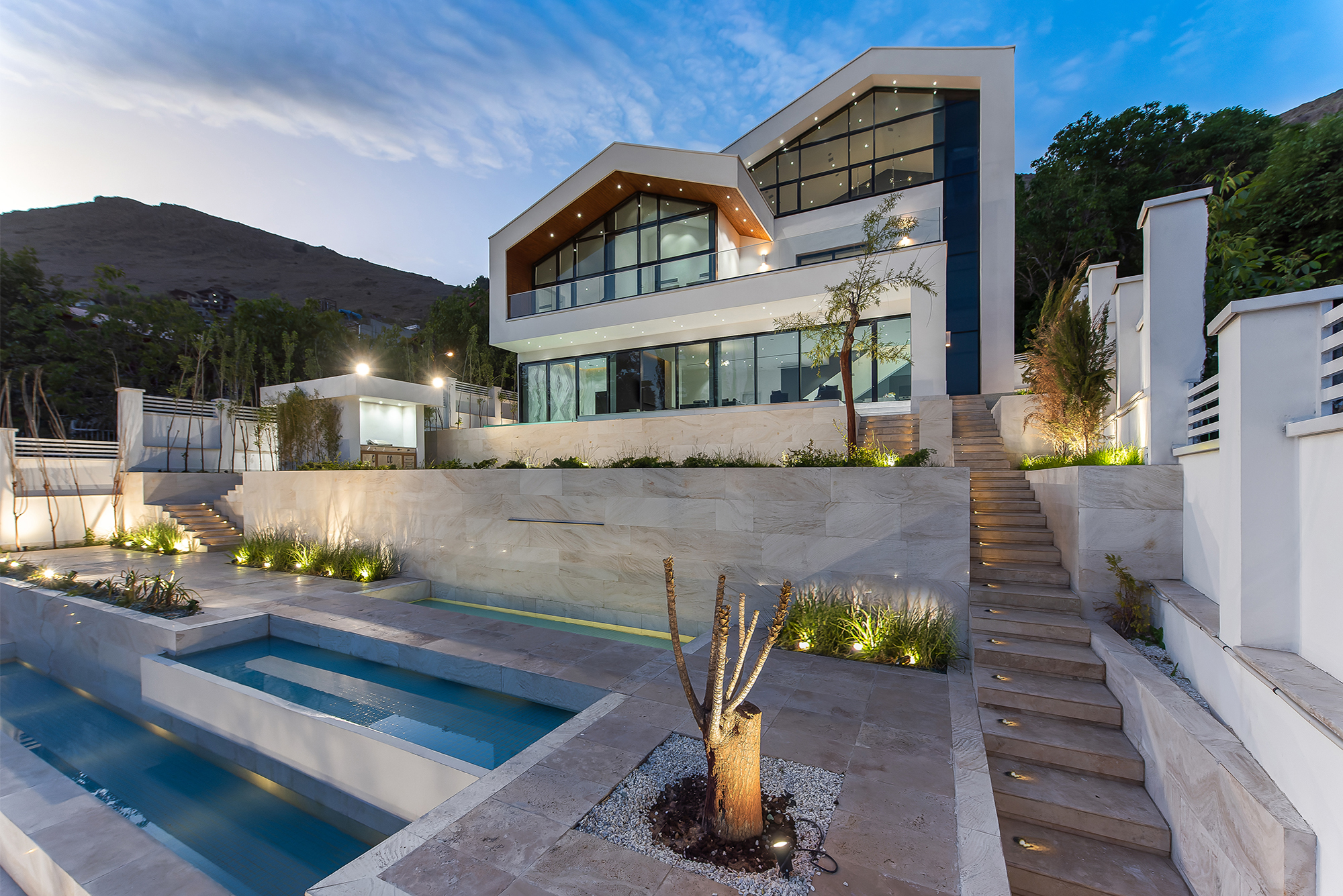 О проекте: При разработке проекта авторы учитывали вытянутость выделенного земельного участка, пытаясь оставить незастроенной его достаточную часть – для размещения различных зон отдыха под открытым небом. Перепад высот на участке составляет 13 метров, что было интересно обыграно с помощью подсвеченных лестниц и разноуровневого бассейна. Один из жилых объем выдвинут вглубь участка относительного второго, а его двускатная кровля защищает внутреннее пространство с панорамным остеклением от палящего зноя.