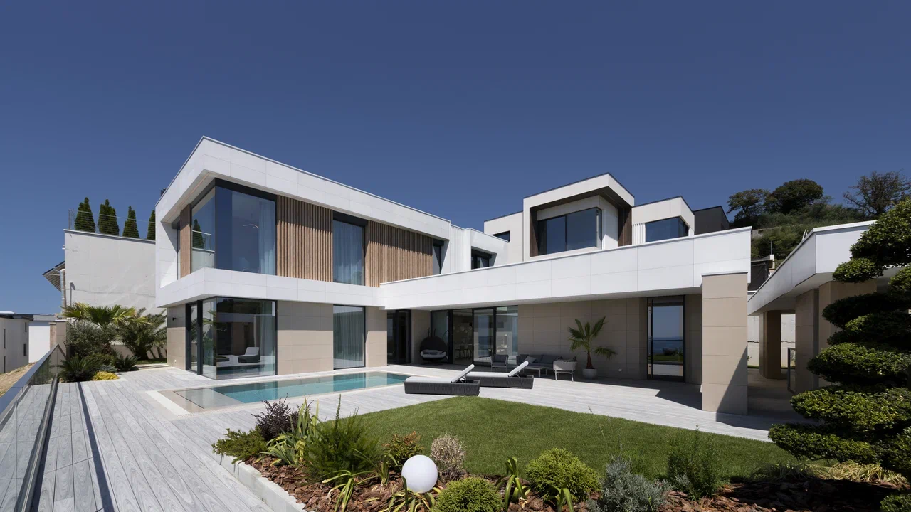 Построенная на живописном взгорье Сочи, вилла открывает захватывающие панорамы Черного моря, соединяя эстетическую элегантность с функциональностью и комфортом. Общая площадь дома 310 кв.м на участке 7,3 сотки, гараж 83 кв.м. Архитектурные формы выверены, фасады выполнены из керамогранита — сочетание долговечности и тонкого визуального впечатления. Интерьеры созданы по авторскому проекту, с натуральными материалами и детальной проработкой.