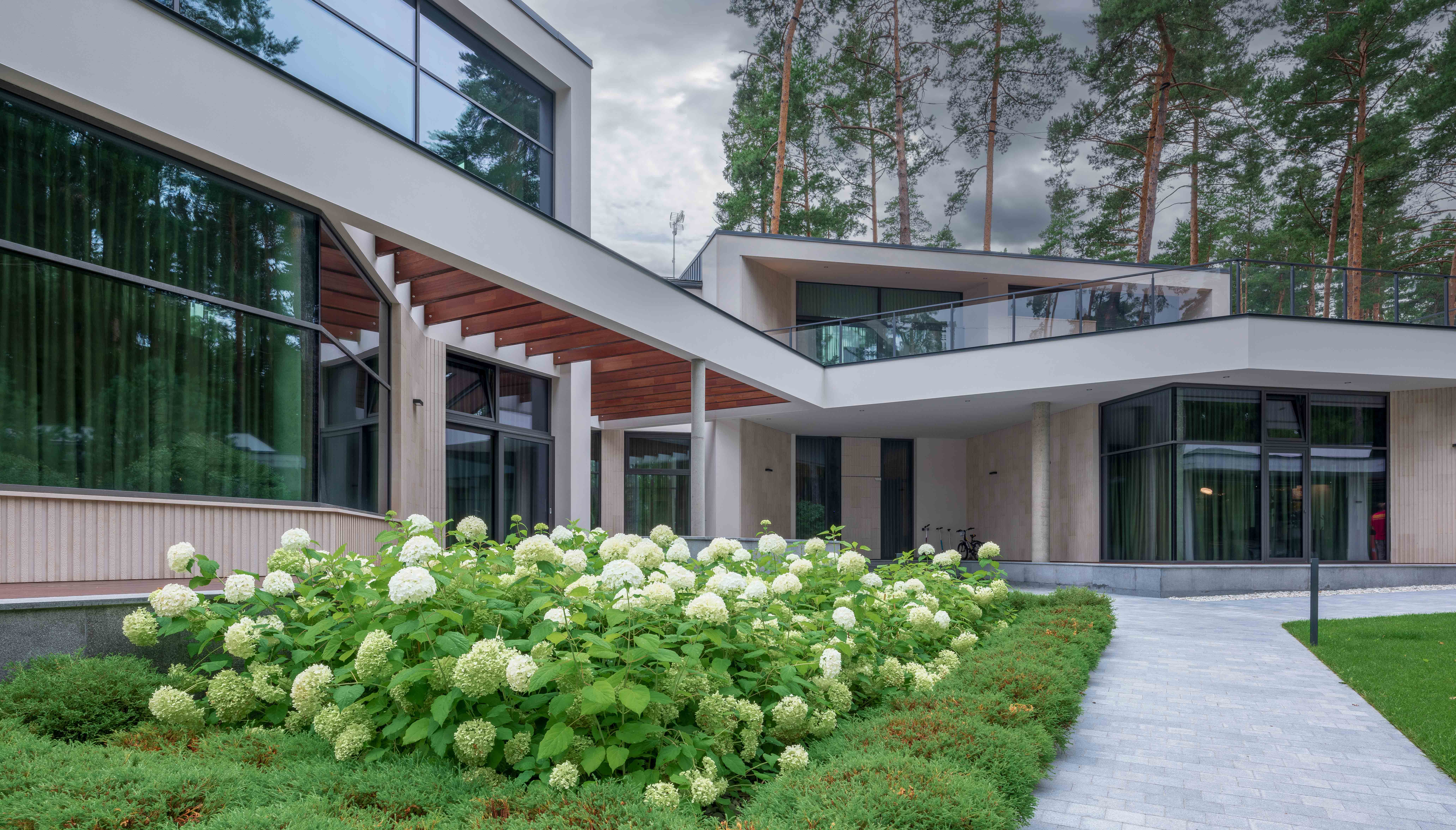 При всей строгости и геометричности своих форм, подчеркнуто лишённых каких-либо декоративных элементов, дом вовсе не производит впечатления сдержанности и минимализма – напротив,умелая комбинация четких объемов,светлого фасада и больших панорамных окон дарит ощущение элегантной красоты и благородства.