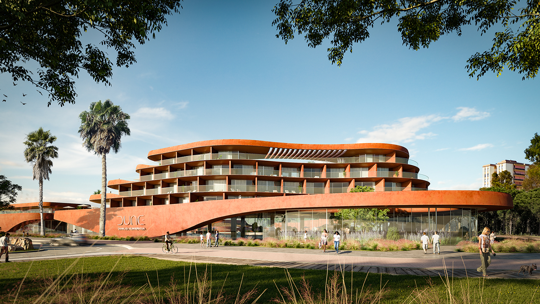 Благодаря своим обтекаемым конструкциям фасада жилой комплекс словно продолжает рельеф участка.