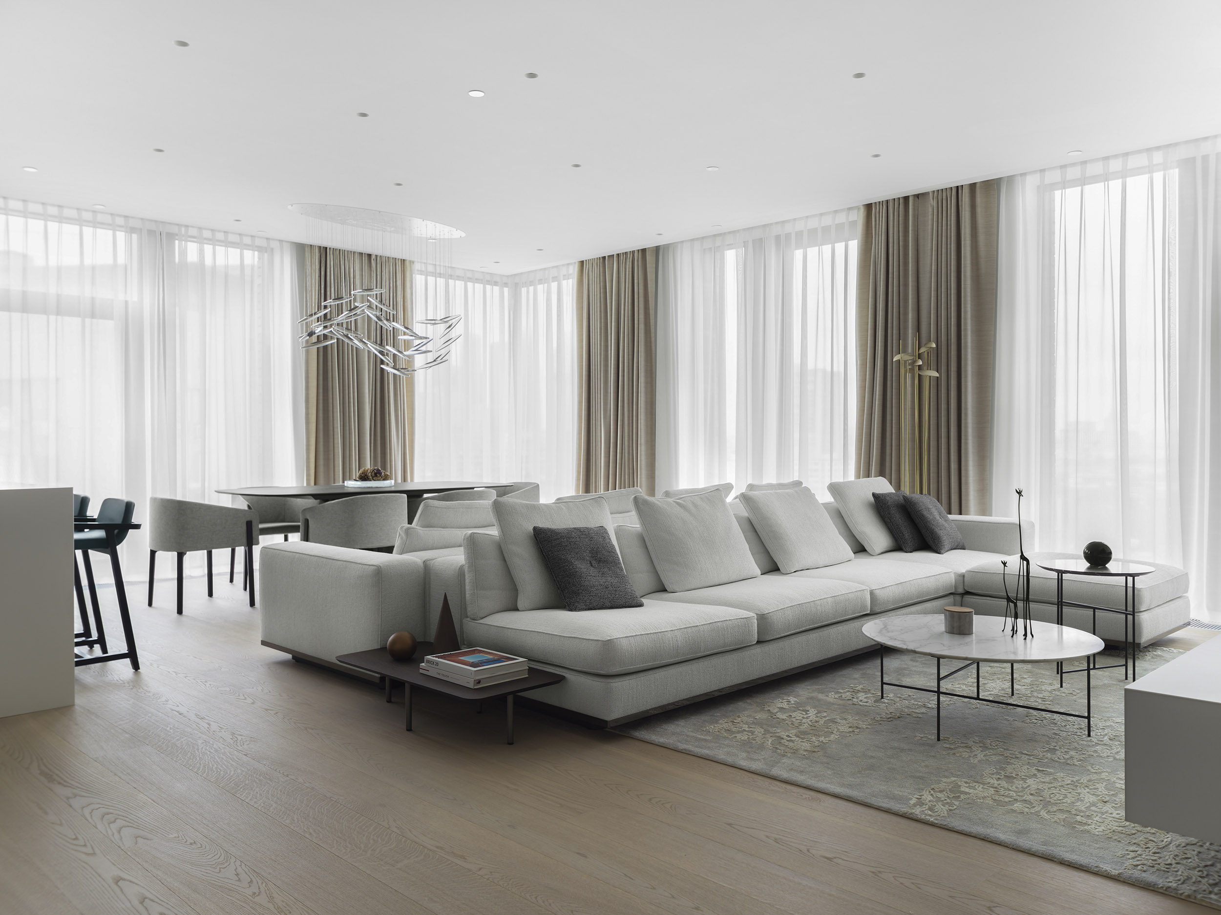 В интерьере преобладают натуральные материалы и светлые тона, которые визуально увеличивают и расширяют и без того большое пространство. Многие предметы интерьера, например, фактурные изголовья в спальнях, разработаны по эскизам архитекторов Kerimov Architects.