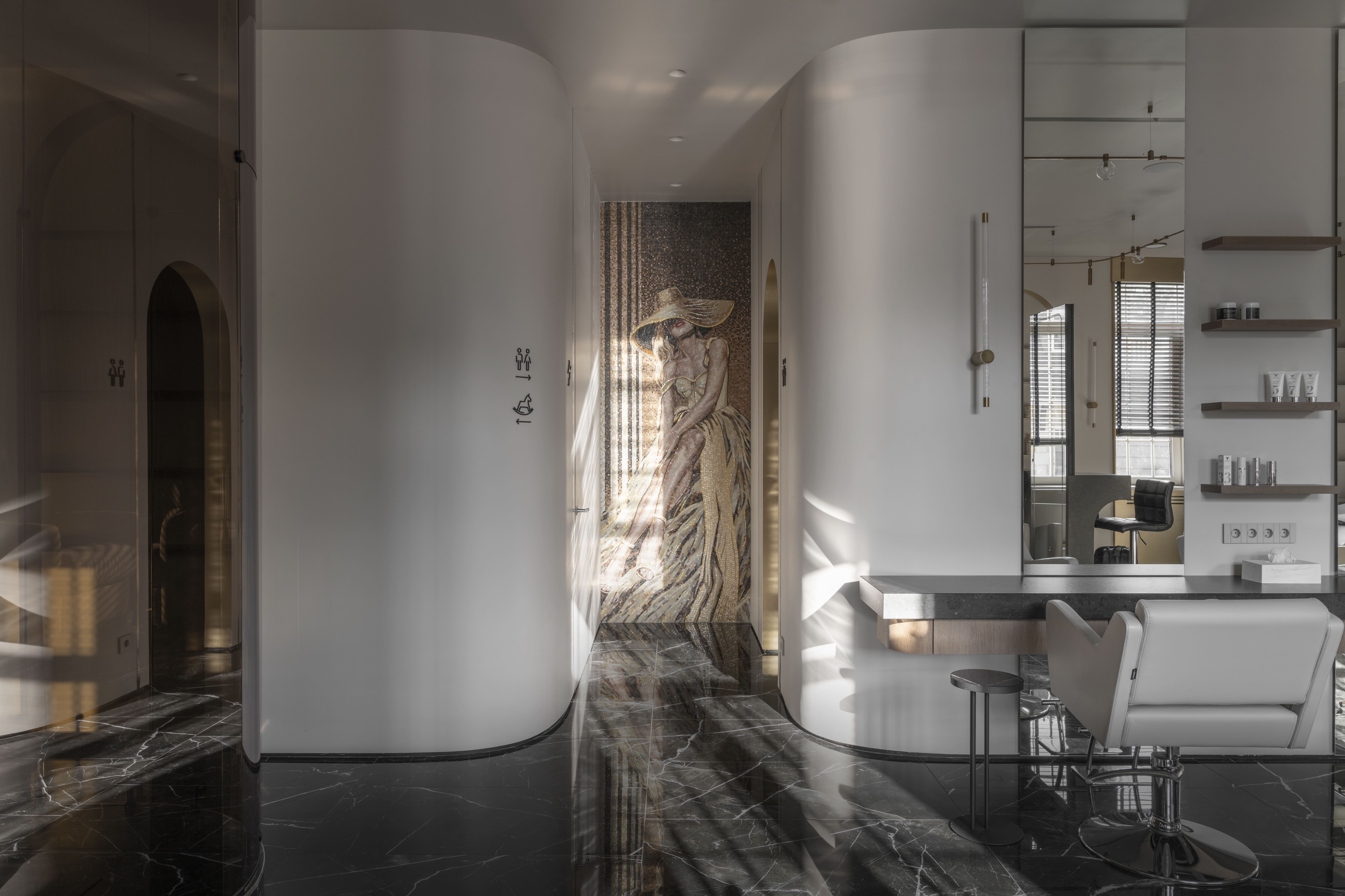 WAVE – это волна, изогнутая и плавная форма. Этот образ бюро MAIN раскрыло через скругленные ассиметричные формы стен и потолка. Первый этаж салона красоты WAVE занимает 150 квадратных метров. Было принято решение в пользу сохранения открытого пространства. Работать с большой многофункциональной площадью совсем непросто: её легко перенасытить деталями, но также легко сделать неуютной, будто бы недостроенной.