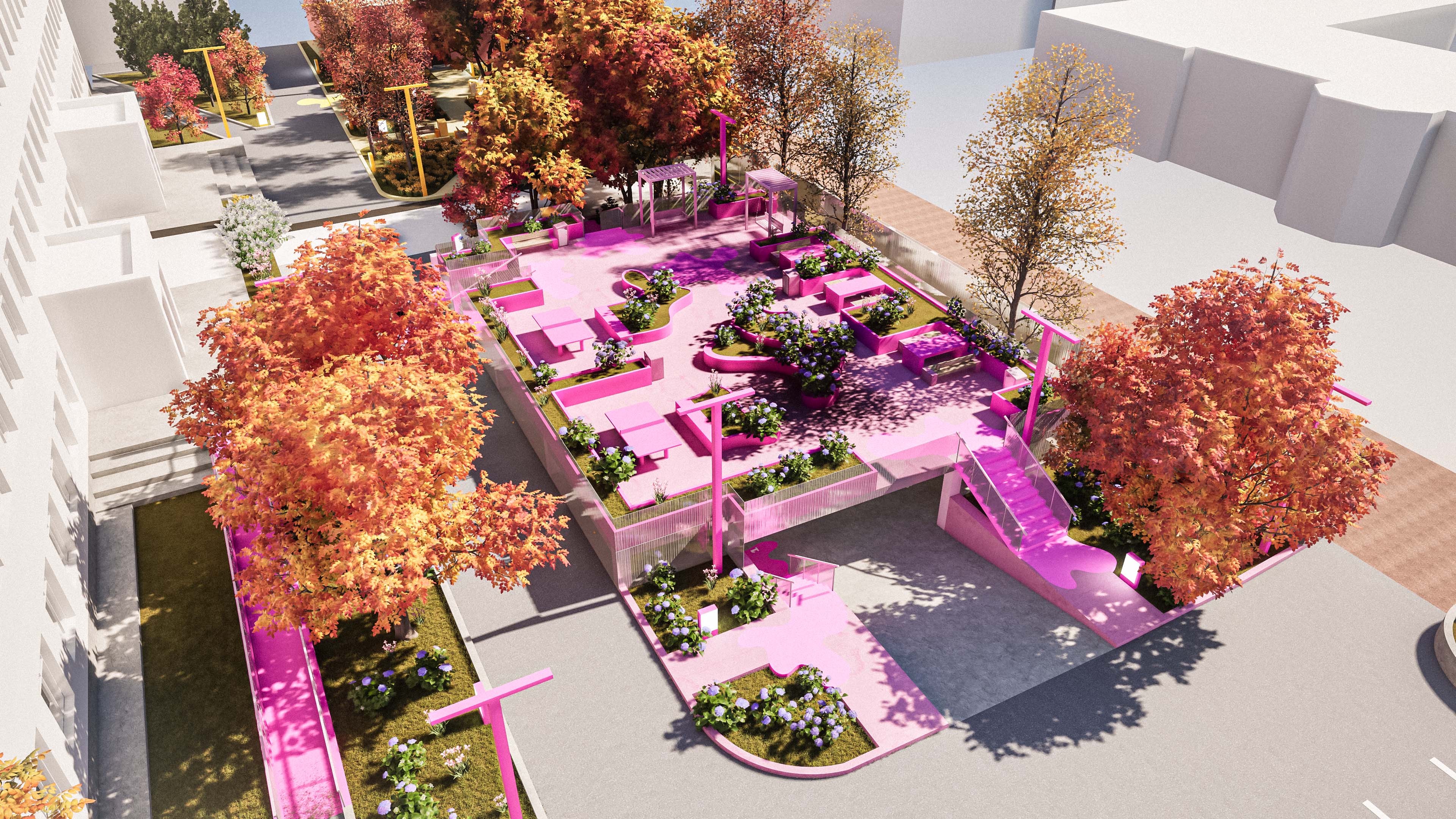 В центре розовой зоны — эксплуатируемая кровля полуподземной парковки, превращённая в террасу с теннисными столами, качелями и клумбами. Старые деревья заменены клёнами, формирующими новую зелёную структуру.