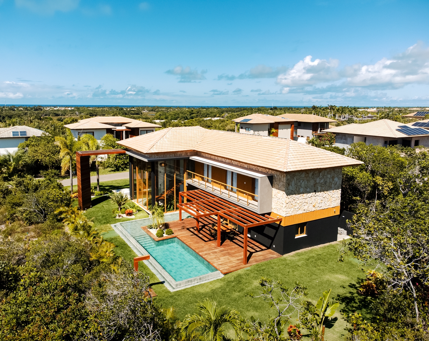 Команда архитекторов в сотрудничестве с командой конструкторов построила эту виллу (или лучше назвать ее пляжным домиком?), ставшую ярким образцом тропической архитектуры. Площадь застройки: 485 м². За счет использования натуральных материалов (дерева и камня) здание отлично вписывается в пышный местный пейзаж. Из больших окон и стеклянных дверей открываются панорамные виды на окрестности, создавая связь между интерьерами и природой. Зона отдыха включает в себя переливной бассейн. Атмосфера дома пропитана тропическим духом, а архитектура и природа здесь звучат в унисон.