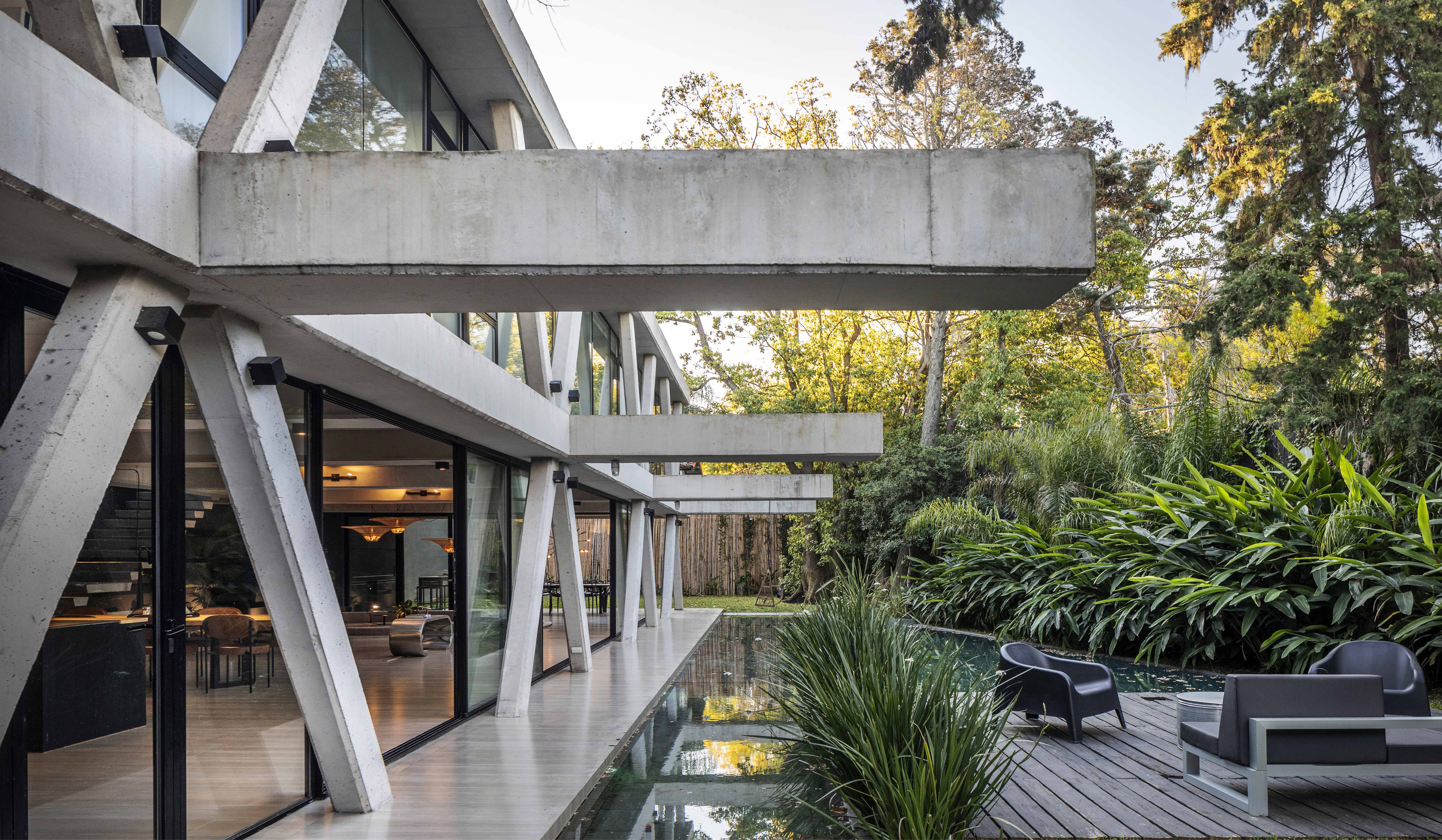 В доме используется система экзоскелета из железобетона, которая определяет как его конструктивную логику, так и архитектурное выражение. Диагональные опоры передают нагрузки на землю, освобождая внутреннее пространство от традиционных колонн, позволяя создавать большие пролёты и открытые планировки. Эта конструктивная стратегия повышает гибкость пространства и оптимизирует использование остеклённых фасадов, обеспечивающих прямую визуальную связь с окружающим ландшафтом.