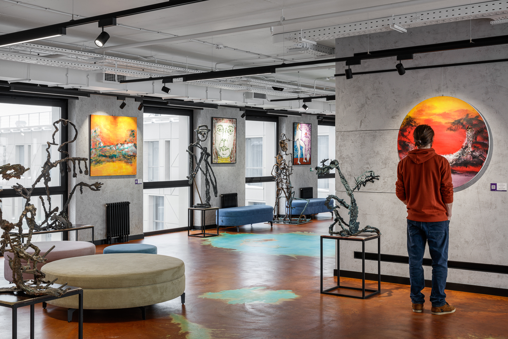 Цветовые решения галереи выполнены с учетом контекста окружения в виде живописных ржавых крыш соседних исторических зданий, иллюстрируя дуализм тёплого и холодного. Наливные полы также повторяют рисунки ржавых крыш, которые видны из окон по всему периметру галереи.