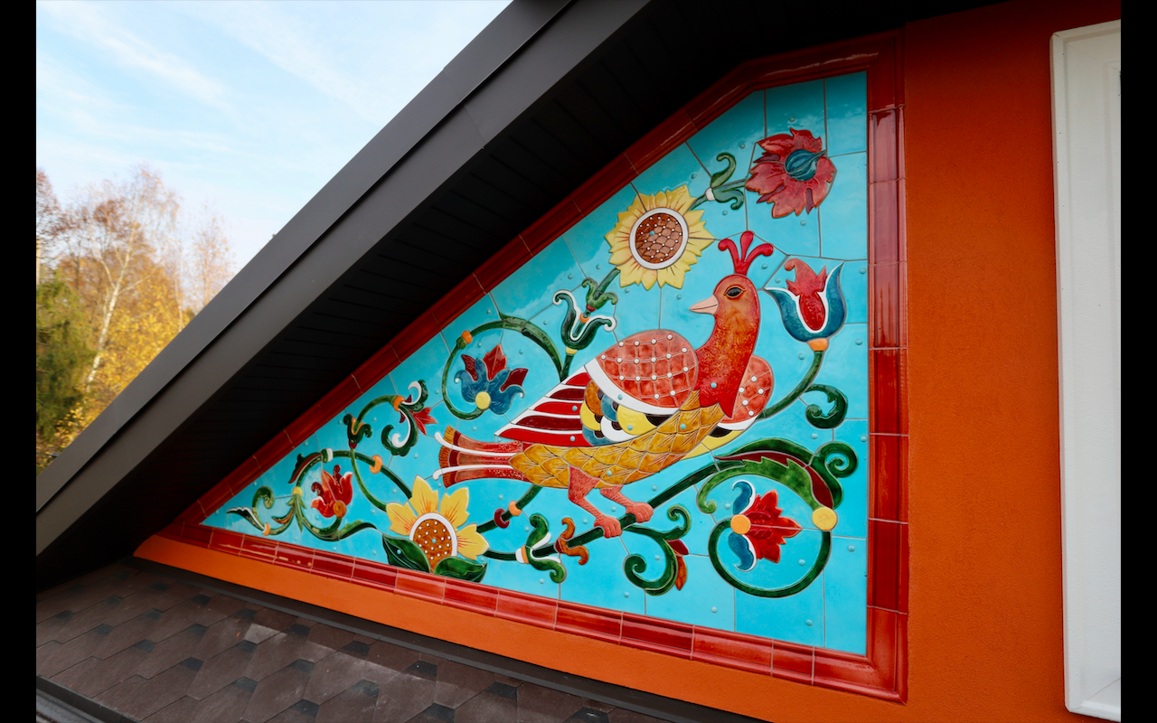 О проекте: Глазурованные декоративные панно и керамическая плитка для фасада загородного дома изготовлены по уникальным эскизам группой художников-керамистов в собственных мастерских. Вся керамика на объекте вдохновлена образцами русского модерна.
