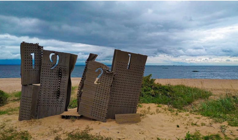The memorial sign is located at the spot where 8 thousand rioters fled from the Fort Reef across the frozen waters to Finland. The memorial is made of pieces of rails and perforated metal that was found around and within the fort during renovation.