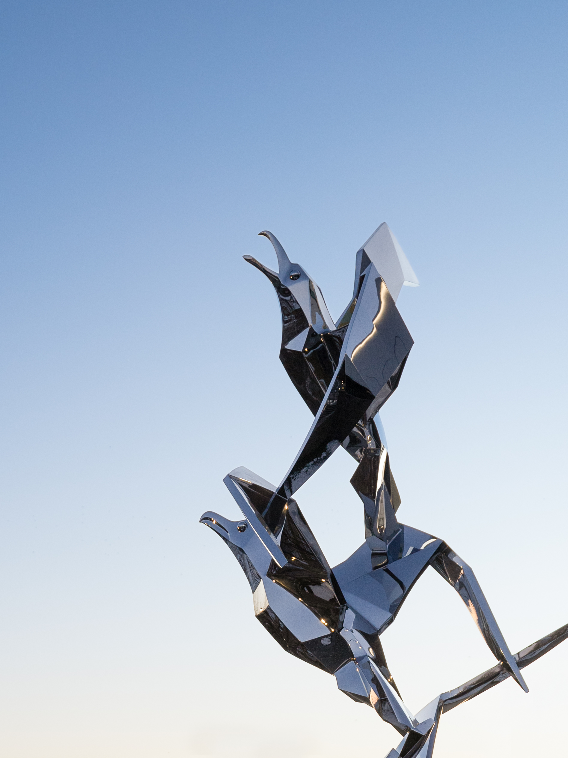 The 5.4-meter-high monument is visually divided into two parts a black granite pedestal featuring an epitaph (square in plan, 1.4×1.4 m, and 1.2 m high) and a sculptural composition crowning it, standing 4.2 meters tall, made of polished stainless steel—a pair of fish and three seagulls. The fish, representing pollock, the cornerstone of the company’s fishing industry, are set against a stylized water surface made of stainless steel atop a granite parallelepiped. The seagulls depict different moments—one catching fish and a pair soaring into the sky—symbolizing the demanding and perilous labor of fishermen.