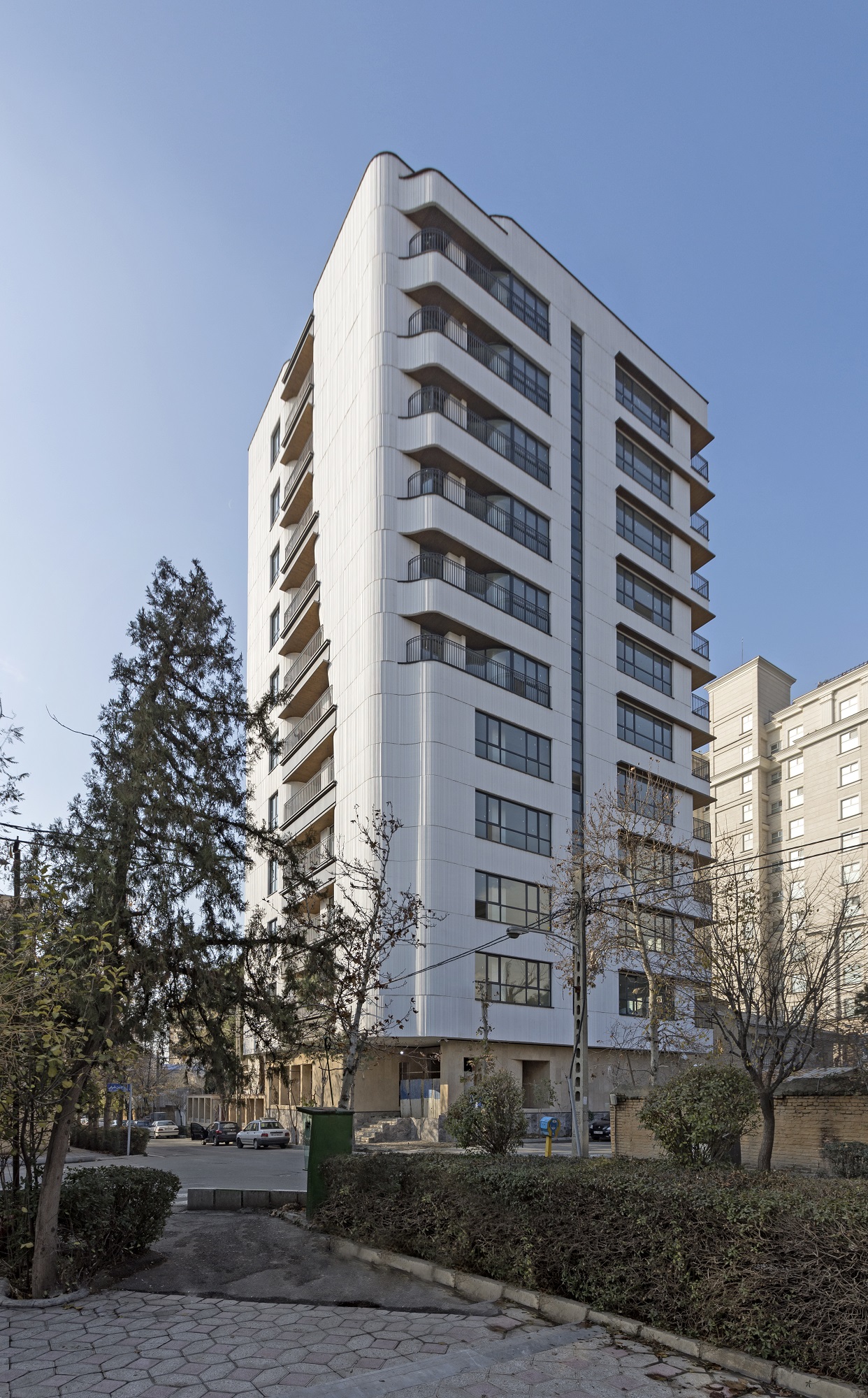 The building consists of ten residential floors with two units on each and three basements, providing parking and subsidiary spaces. The idea of the facade design is derived from the combination of curved lines and rectangular surfaces and using plaster wrapping around the building and changing as it goes higher. This vertical changes in the facade led to the formation of useful terraces in different situations.