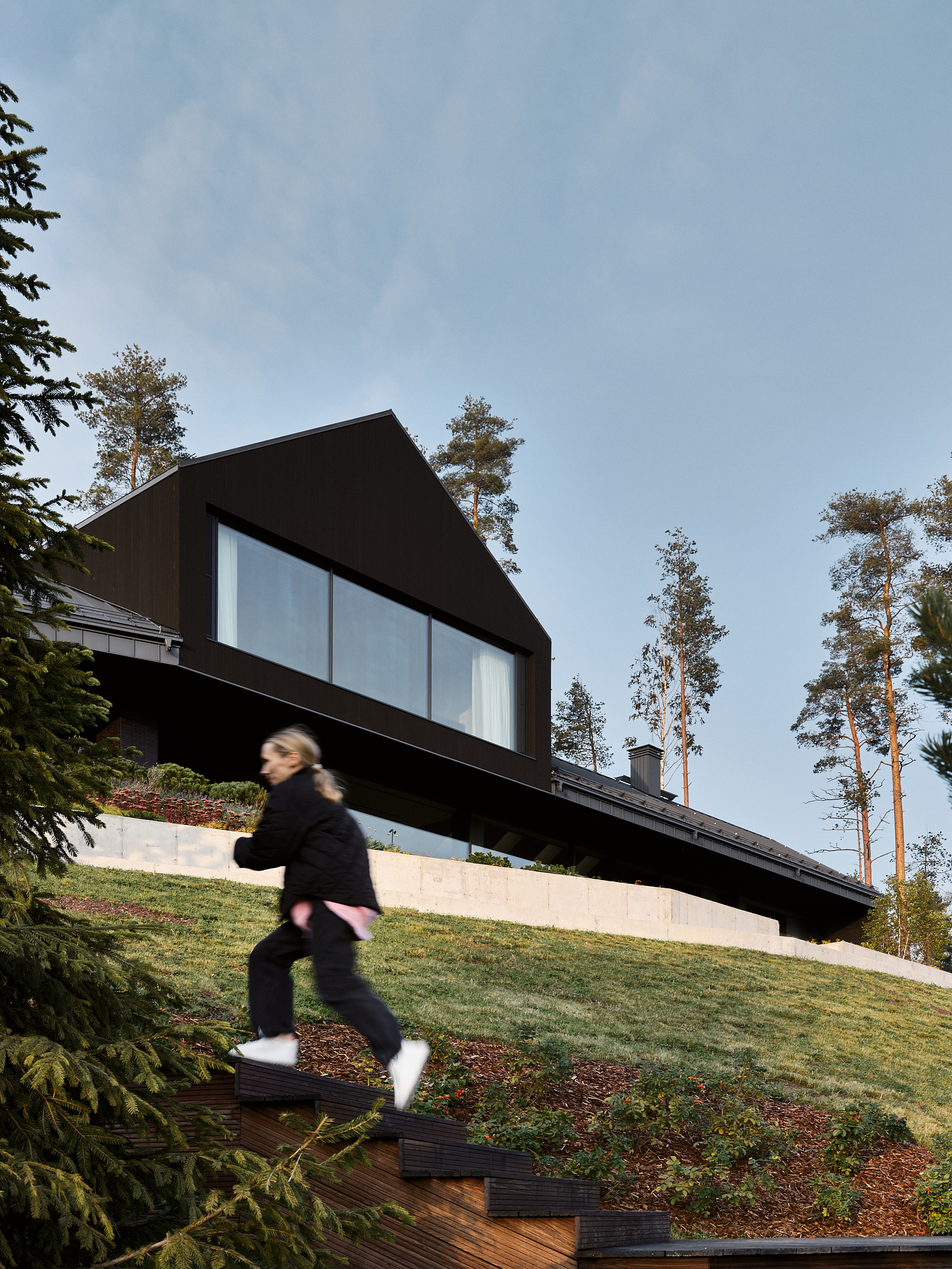 A1 House, spanning 506 sq.m., is a technically sophisticated, eco-friendly home nestled on a slope above the Gulf of Finland. Surrounded by forest and integrated seamlessly into the untouched natural landscape, the house features terraces, relaxation zones, and a spa.