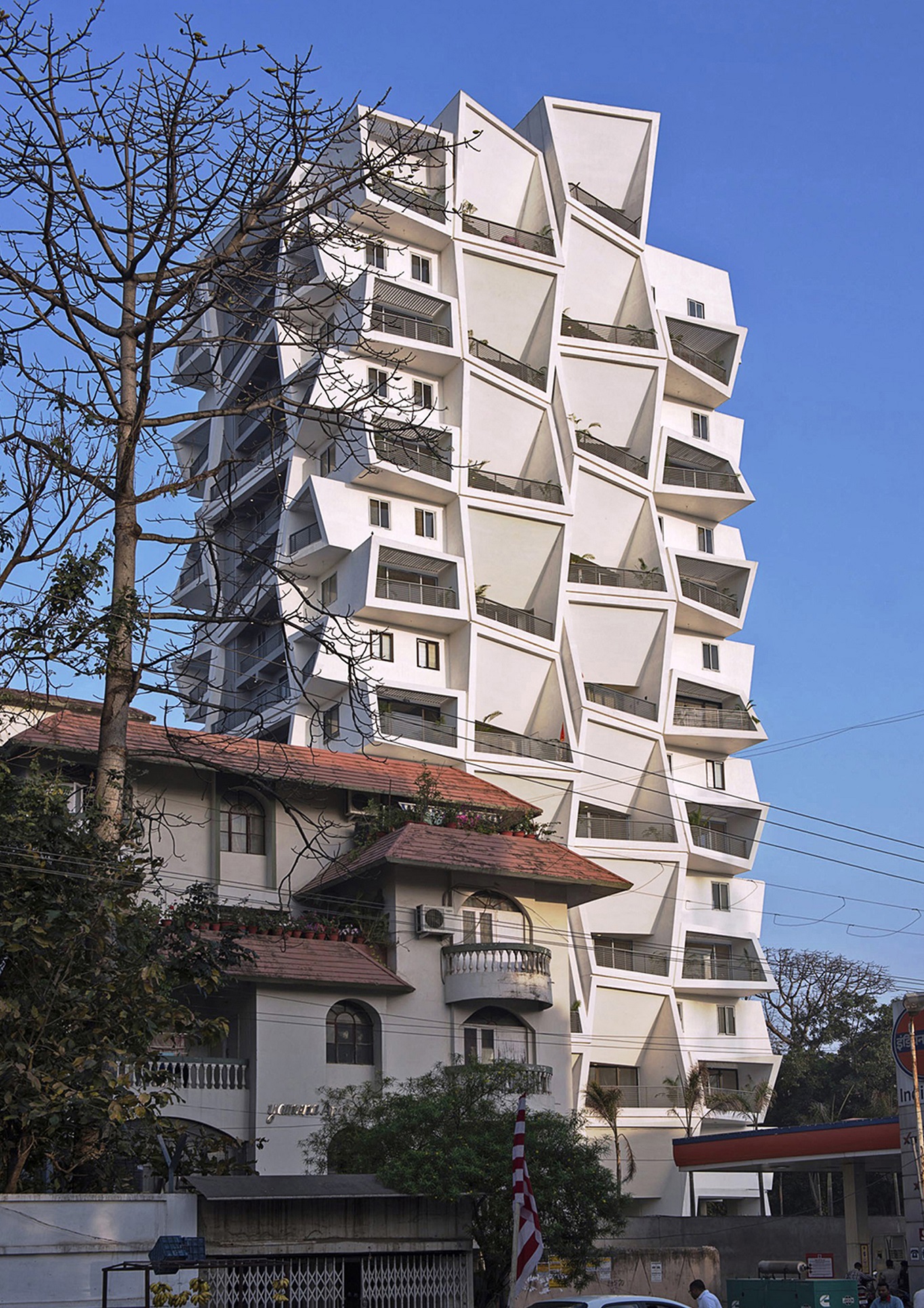 Situated in Ranchi, Ishatvam 9 is a residential building on a small plot of 1800 sqm. Most of this city has existed with low rise development. The last few years have witnessed rapid urbanization & in response to this the governing rules have been changed to allow 50m height & buildable area 3 times the plot size. Most of the city’s inhabitants have been used to living in individual houses with private gardens & open spaces. Therefore, the apartments in Ishatvam 9 have been designed to occupy a complete floor with each room extending into 20’ feet high, double height decks.