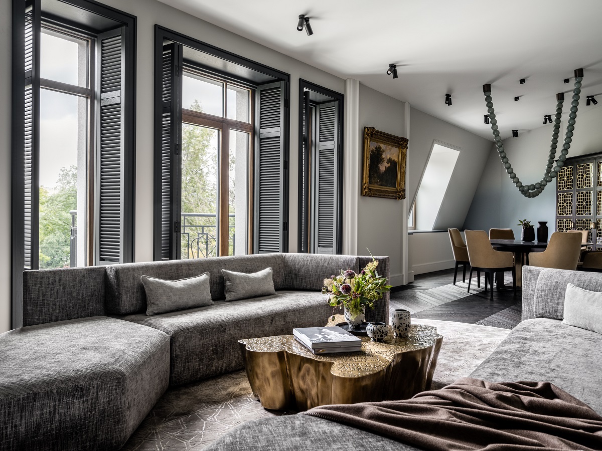 Surprisingly, the most interesting place in the apartment is its long corridor with vaulted ceiling, expressive moldings over the made-to-order doors and the window opposite the entrance. The apartment is located in a newly build house, but the designers managed to create an interior that looks as if many generations of the family have been living here. Wooden window shutters and a real fireplace in the sitting room contribute to the atmosphere of European Neo-Classicism. Grey and blue gradient walls became a cool background for the paintings.