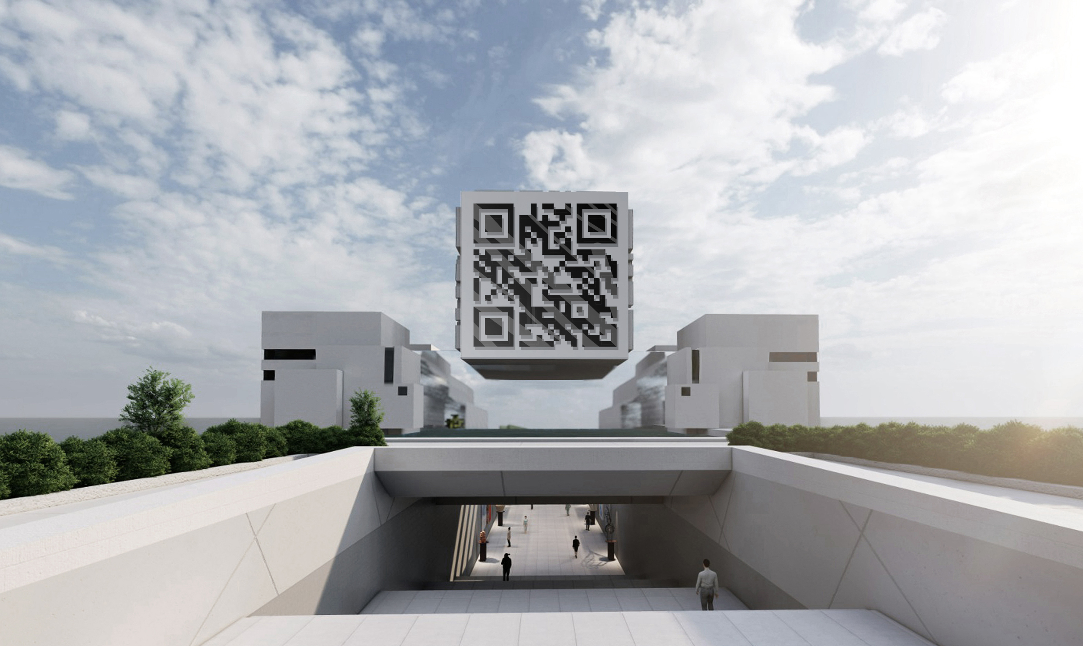 About the project The floating technology is the aesthetical fundamental of contemporary art. The facades of the main building are designed as a QR code that can be scanned from the outside to see the timetable.