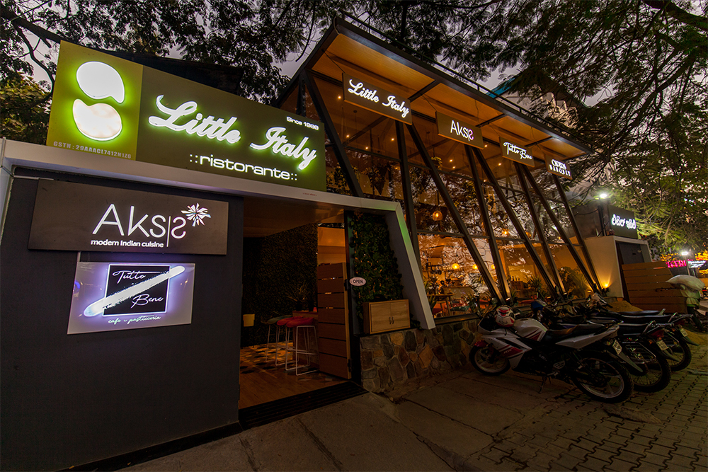 Little Italy, Akss, and Tutto Bene were to coexist. The existing elevation was completely redesigned to showcase the novel vision, and better reflect the brands new orchestration. Little Italy indoor hall followed a palette that was new but did not deviate from the original at the same time. Devising the ceiling as the dominating trait left the walls free of this duty and gave the space its typical soft elegance.