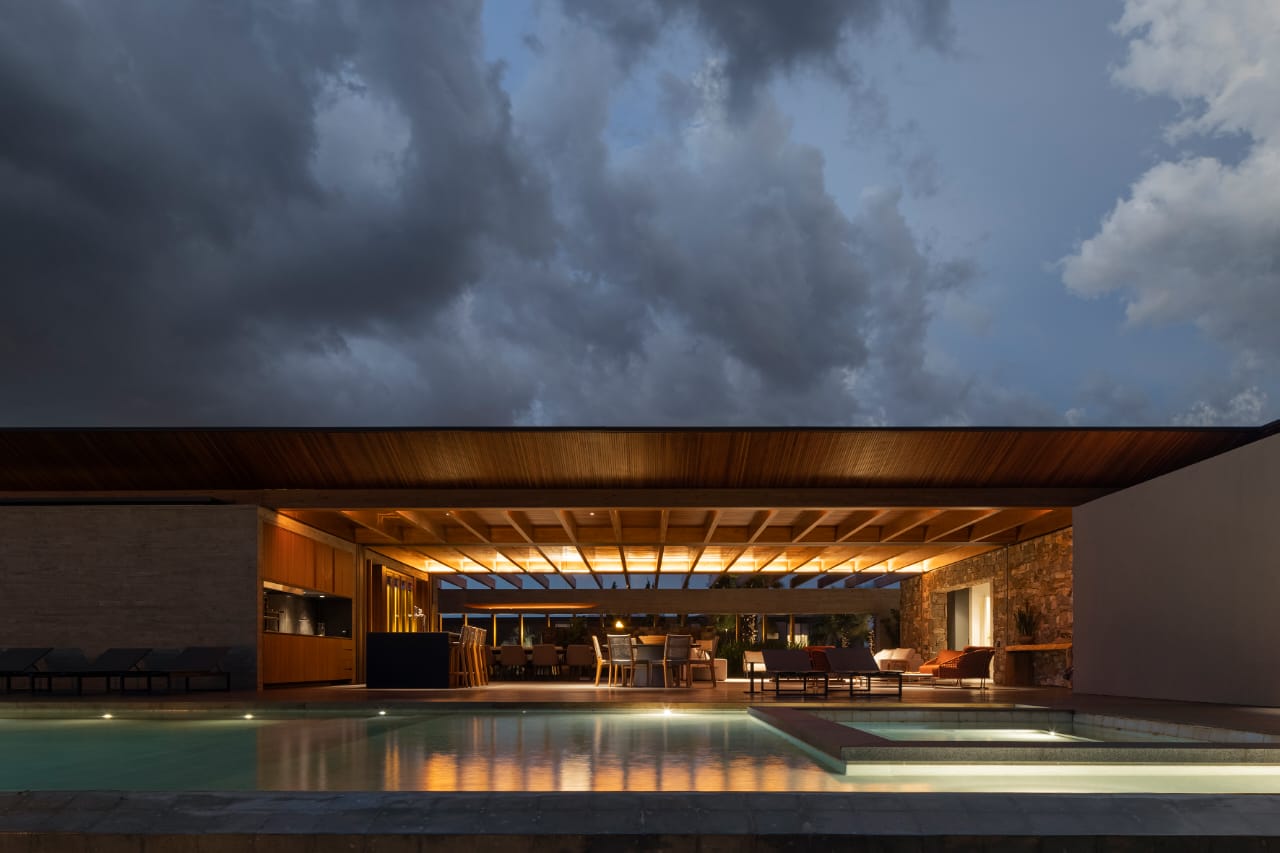 The project has several suites and generous environments, since the house was designed to be used collectively. All spaces are connected by a beveled wood crown, which is supported by the pergola by transforming into wooden beams under the social volume.