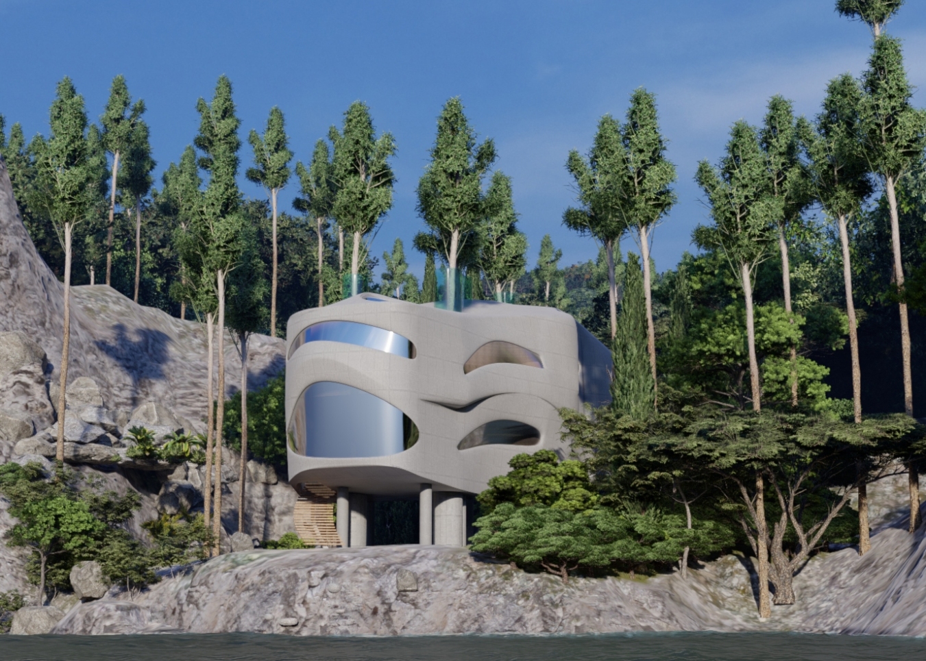 About the project The house is perched upon a hard strata of rock and nestled amongst a dense foliage of trees overlooking a vast expanse of serene blue waters. Taken a sensitive approach towards design by developing massing of the house in such a way that it merges with the surrounding context. The visual aesthetics were developed in such a way that the building stands out without being obtrusive to the physical geography and abutting network of rich vegetation. Breaking away from a normative formulation of a typical house layout, we have come up with an idea of a farmhouse that coexists with its natural environment. The plan creates an interesting flow of habitable spaces which merge with the existing landscape creating a series of liminal spaces that blur the indoor-outdoor transitions. Its attempt to create a spontaneous sense of openness while designing the residence. The project has tried to push boundaries of creative thinking in terms of design.