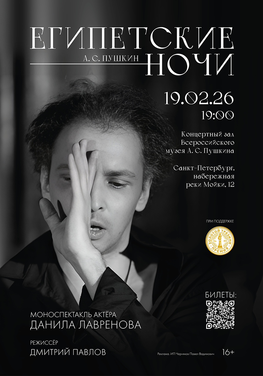19 февраля 2026 года в концертном зале Мемориального музея-квартиры А. С. Пушкина в Санкт-Петербурге впервые состоится показ моноспектакля «Египетские ночи».