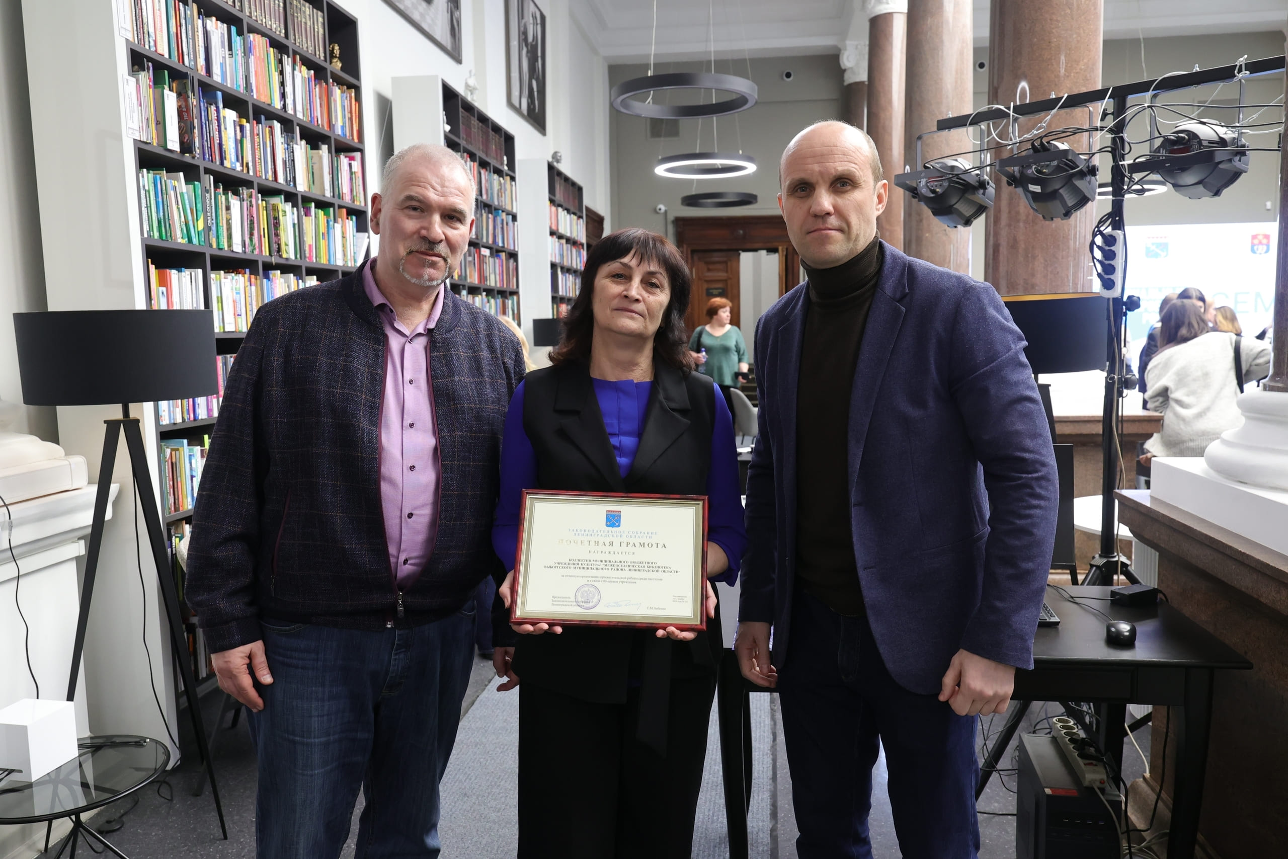 В благодарность коллективу за плодотворную работу он передал директору Межпоселенческой библиотеки Татьяне Черенковой почетную грамоту Законодательного собрания Ленинградской области, пожелав дальнейших успехов и процветания.