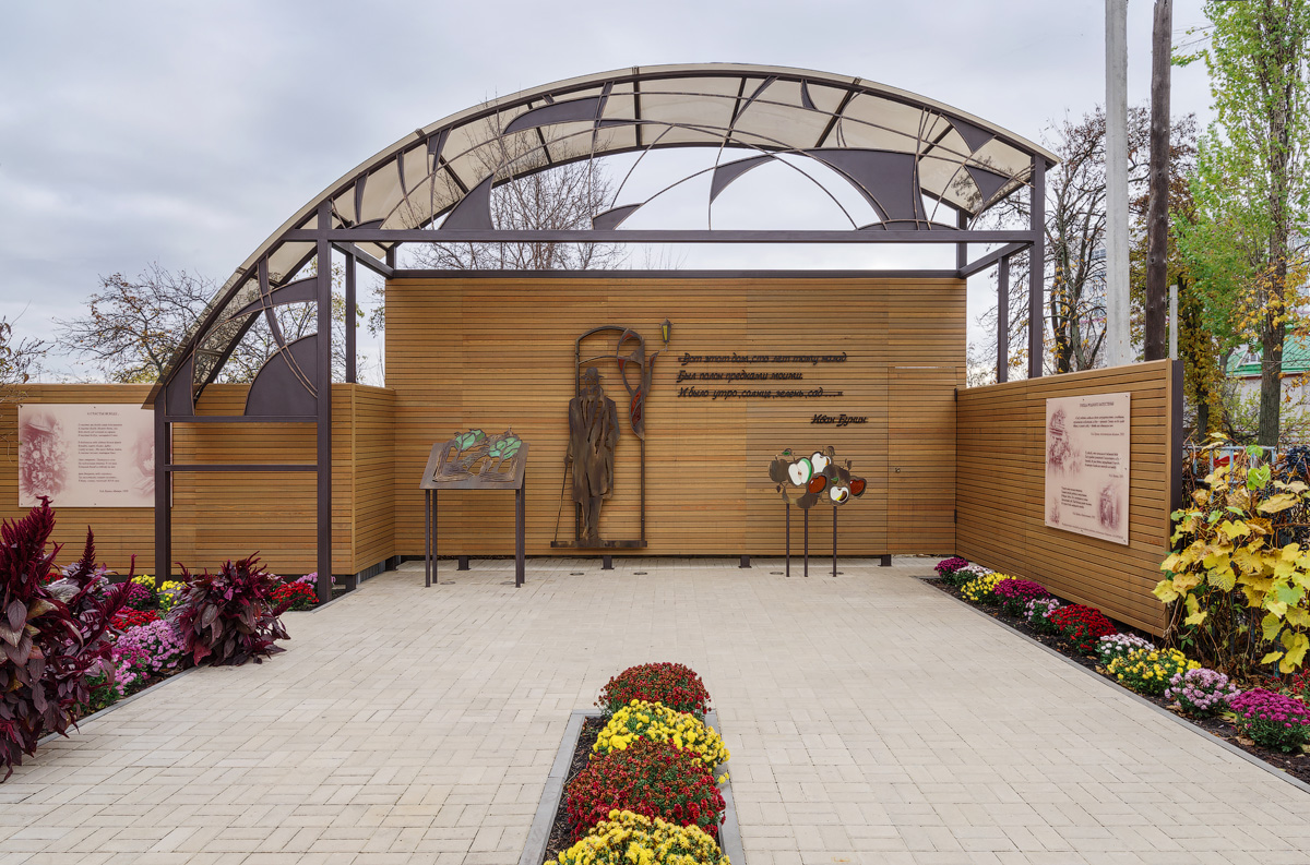 Описание концепции: хрупкость детских впечатлений, отображенных в стеклянном мире витражей, переходит в историю жизни и творчества И. А. Бунина во внутреннем музейном пространстве и затем обретает осязаемую монументальность в арт-объектах, выполненных из металла и стекла. А архитектоника возвышающейся над арт-объектами конструкции символизирует величину личности писателя и его огромного вклада в Российскую и мировую литературу