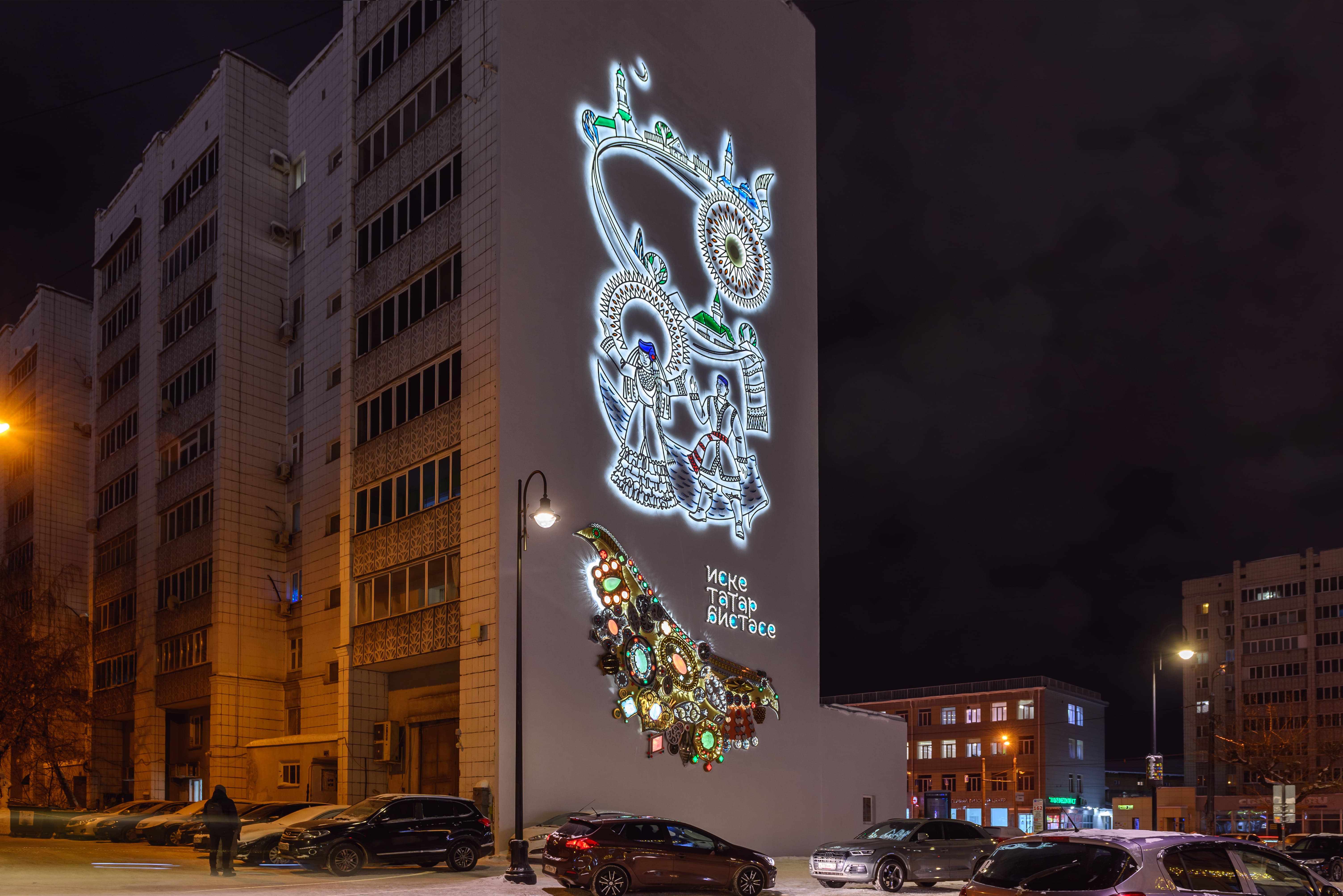 Описание проекта, предоставленное заявителем: В рамках мероприятий и работ по проекту "Туркод" (Старо-Татарская слобода) выполнена монументальная композиция "Хасите". Она располагается на торце жилого дома по ул. Татарстан г. Казани и представляет собой уникальное увеличенное женское национальное украшение. Стальная конструкция включает элементы витражей по технологии "Тиффани". Украшение имеет декоративную подсветку, эффектно выглядит и привлекает собой жителей и гостей города.