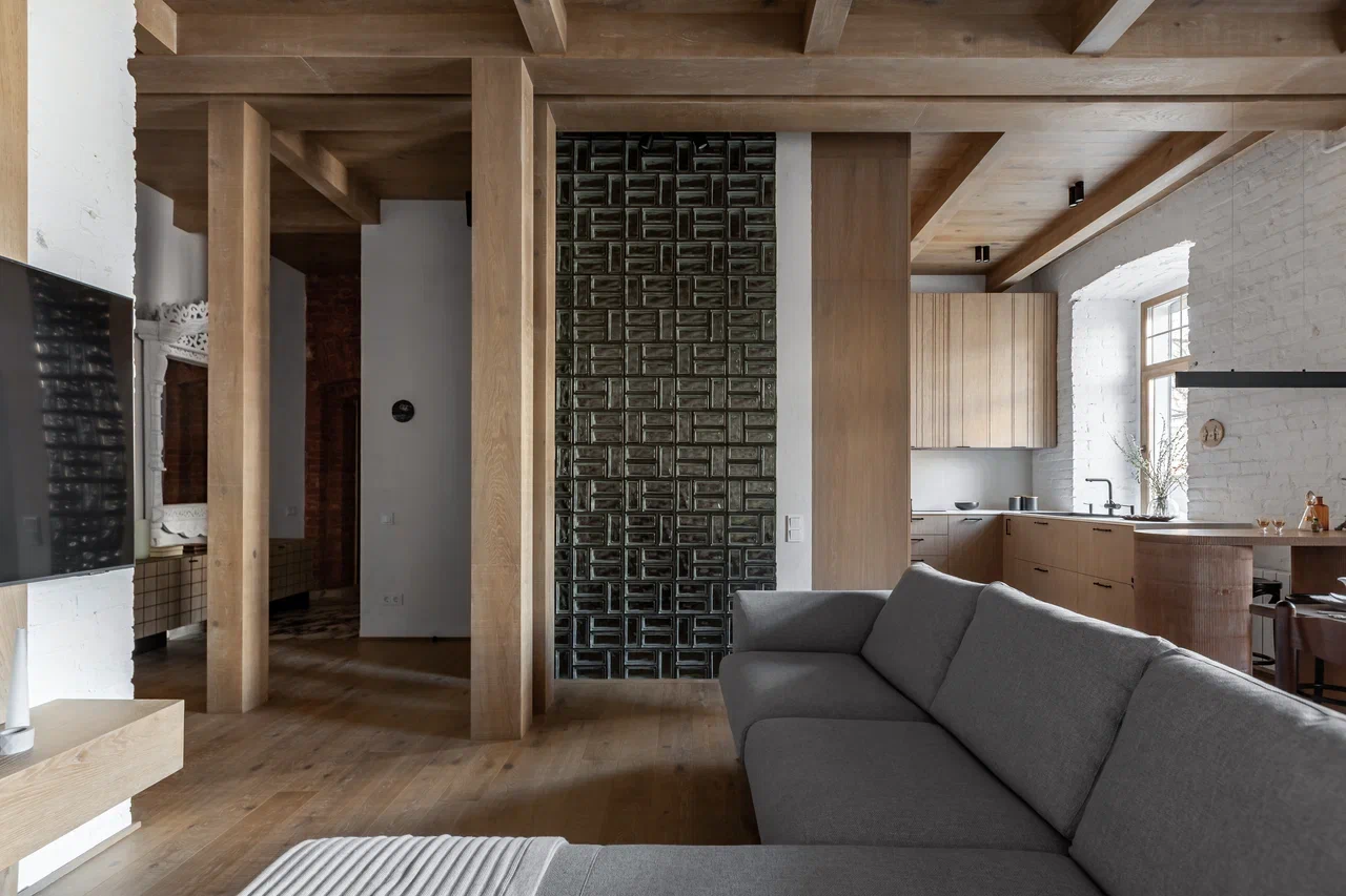Визуальная эстетика материалов может не только создавать стиль интерьера, но и рассказывать, взаимодействовать с хозяевами. Самые чувственные и эмоционально добрые фактуры были выбраны для оформления семейной квартиры. Брашированная древесина, натуральный камень с текучим рисунком, пузатые стекла блоков, кирпичная кладка, резное дерево, монохромная штукатурка – всех их объединяет природная цветовая гамма. До каждого материала приятно дотрагиваться, проводить рукой и чувствовать тепло. Дерева здесь много – оно дает энергию, хранит истории и наполняет дом уютом. Чтобы избежать монотонности в использовании деревянных поверхностей, было принято решение комбинировать отделки, максимально сохраняя выбранное направление по цвету – потолки и балки, двери и дверные порталы, полы и даже кухонная мебель выполнена из МДФ со шпоном.