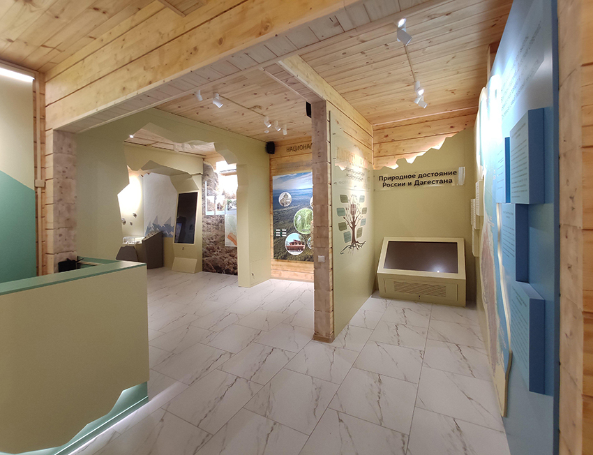 Здание визит-центра - постройка из клееного бруса с высокими потолками (порядка 8 метров в коньковой части). Основная задача проекта - отразить все многообразие и красоту национального парка. Экспозиция - это путешествие по тематическим блокам кластеров заповедника. Пространство 1-го этажа визит-центра посвящено природному достоянию национального парка. Первой освещается тема горного кластера «Шалбуздаг». Затем, пройдя через лиановый лес, посетитель знакомится с водным кластером «дельта реки Самур». На 2-м этаже представлены темы историко-культурного наследия территории национального парка «Самурский». Дагестанский фольклор, культурно-исторические памятники, народы южного Дагестана – эти темы отражены через интерактивные мультимедийные комплексы и дополнены предметным рядом, собранном у жителей края. Антресоль над многофункциональным залом - площадка для размещения интерьерной зоны лезгинской сакли, завершающей экспозицию визит-центра.